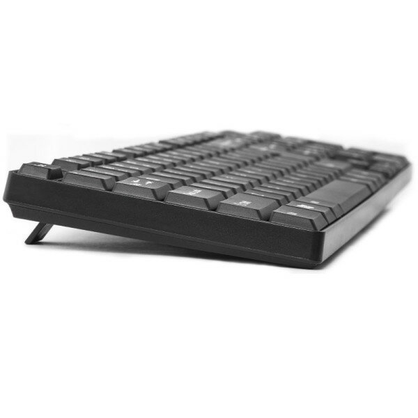 Черный цвет, матовый пластик, влагоустойчивый корпус и стандартная раскладка из 104 клавиш. В общем, настоящая классика. Клавиатура может как плотно прилегать к столу, так и стоить под углом - достаточно лишь отогнуть расположенные в нижней ее части ножки.