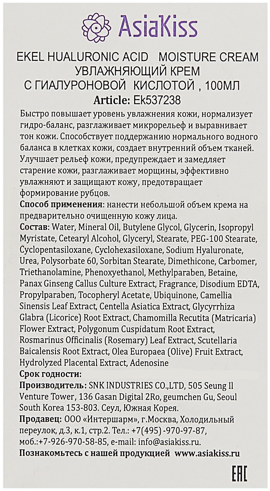 - 537238 Ekel Moisture Cream Hyaluronic Acid Крем для лица увлажняющий с гиалуроновой кислотой 100 гр