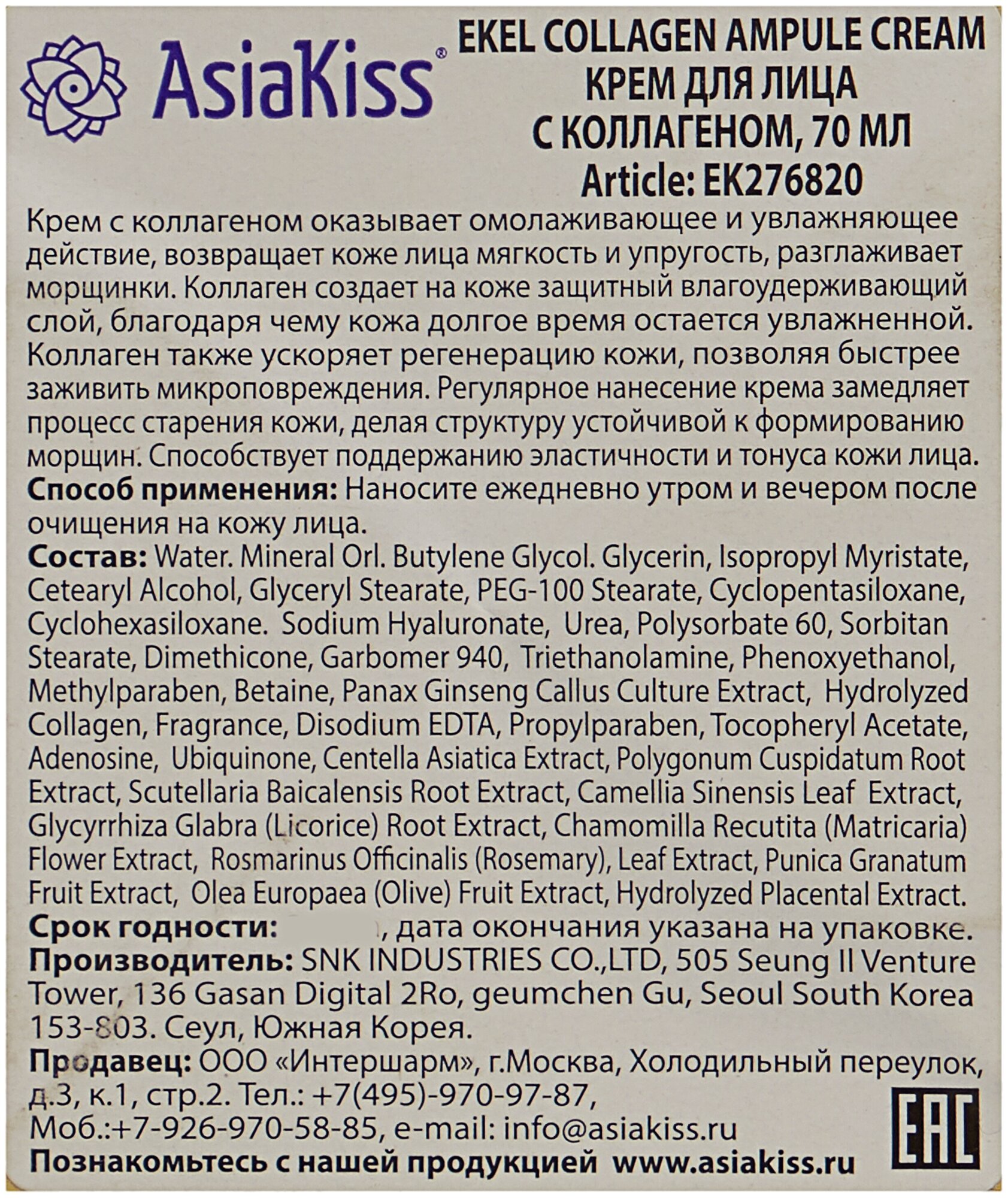 Сервис сравнения цен СкидкаГИД предлагает сравнить цены на товар «Ампульный крем для лица EKEL с коллагеном Collagen Ampule Cream 70мл»