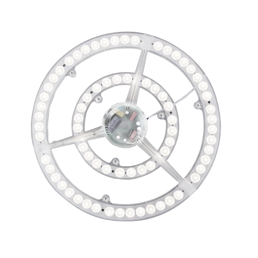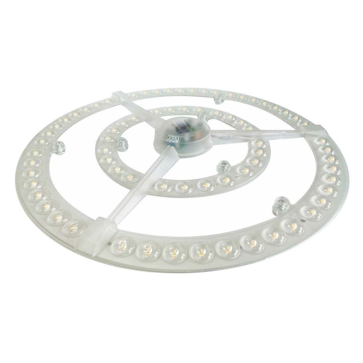 Модуль светодиодный с драйвером — бытовой источник света, выполненный в форме диска. Устанавливается в светильник со стеклянным или пластиковым плафоном, крепится к металлическому основанию на магниты, которые входят в комплект. Потребляемая мощность — 72 Вт (высокий класс энергоэффективности А+). Это на 0,8 ниже, чем у лампы накаливания с аналогичной яркостью света.