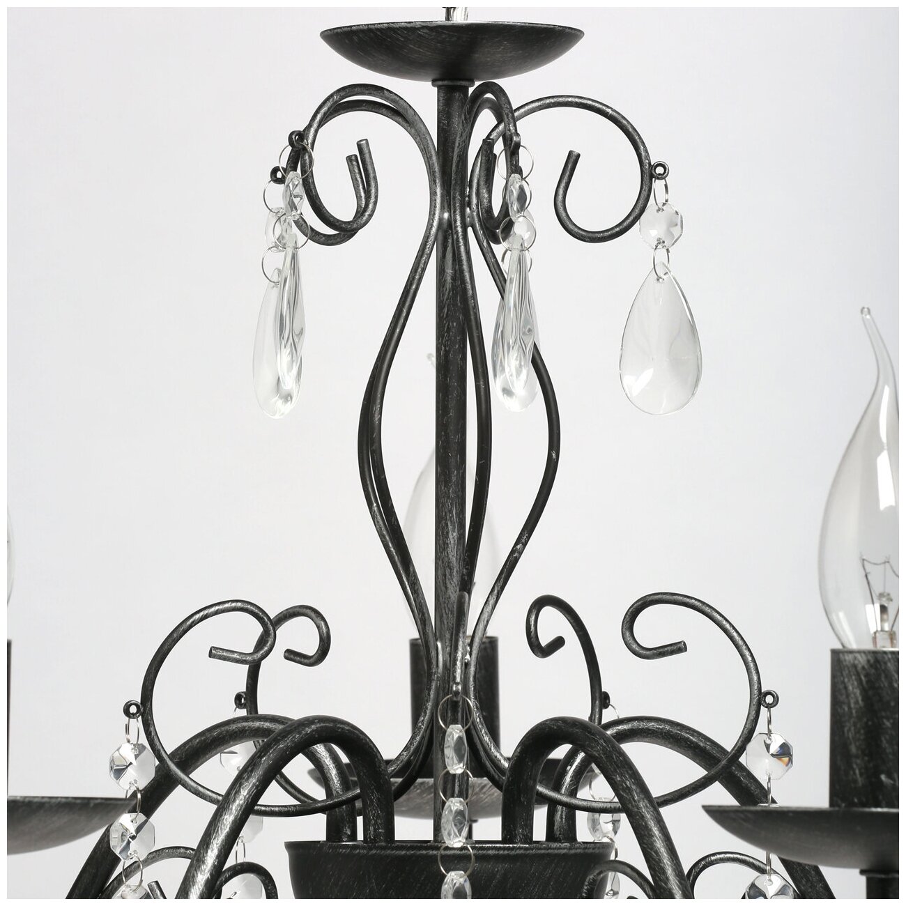 Классическая форма рожков-свечей с основанием черного цвета с серебристой патиной.Декор из хрустального стекла создает игру света.Акцент в виде хрустального шара в центре композиции.Возможность регулировать высоту светильника за счет звеньев цепи.