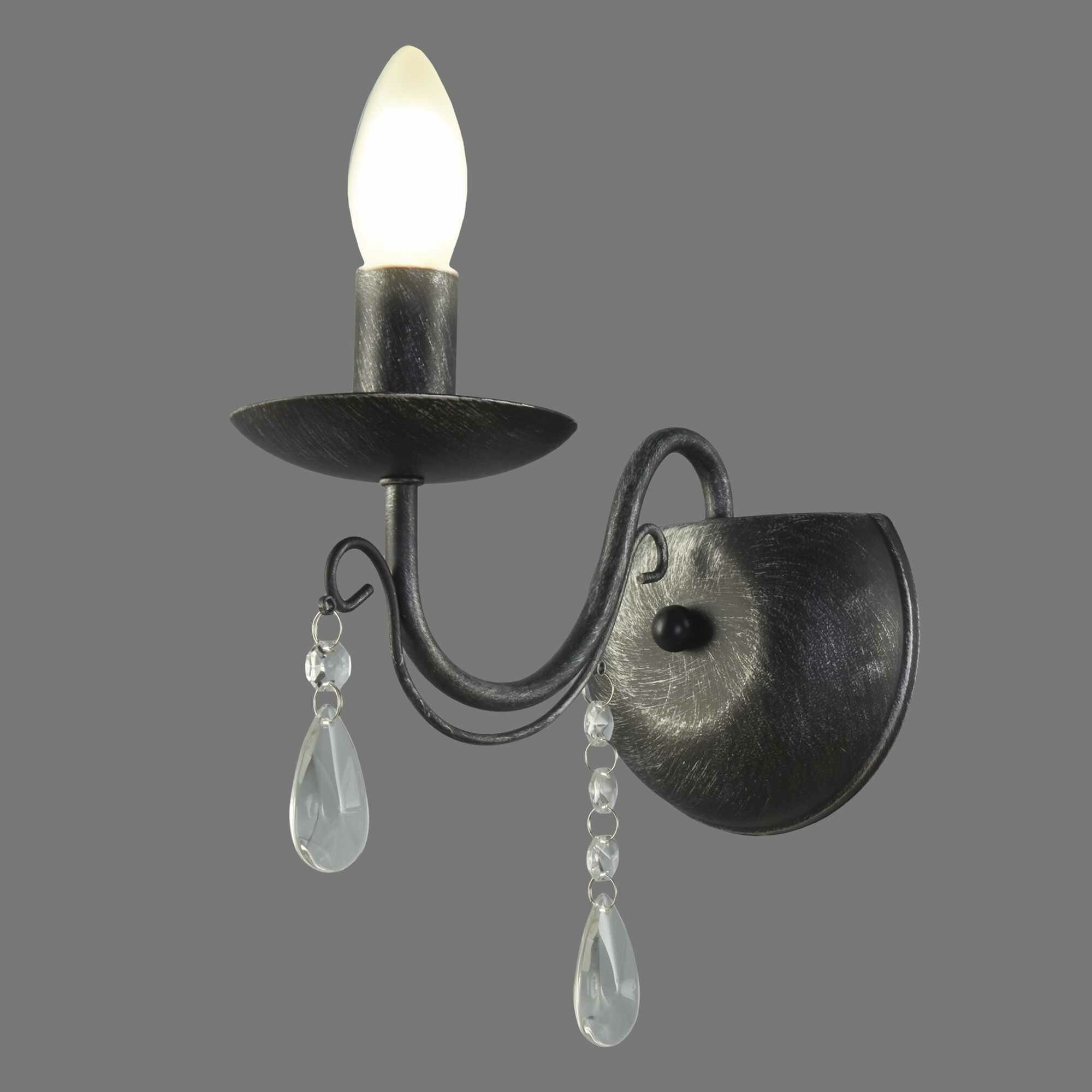 Основание светильника выполнено из металла и обработано по технологии хай-лайт, где основной слой черного цвета, а декоративный слой серебряного цвета. Светильник декорирован прозрачным хрусталем.
