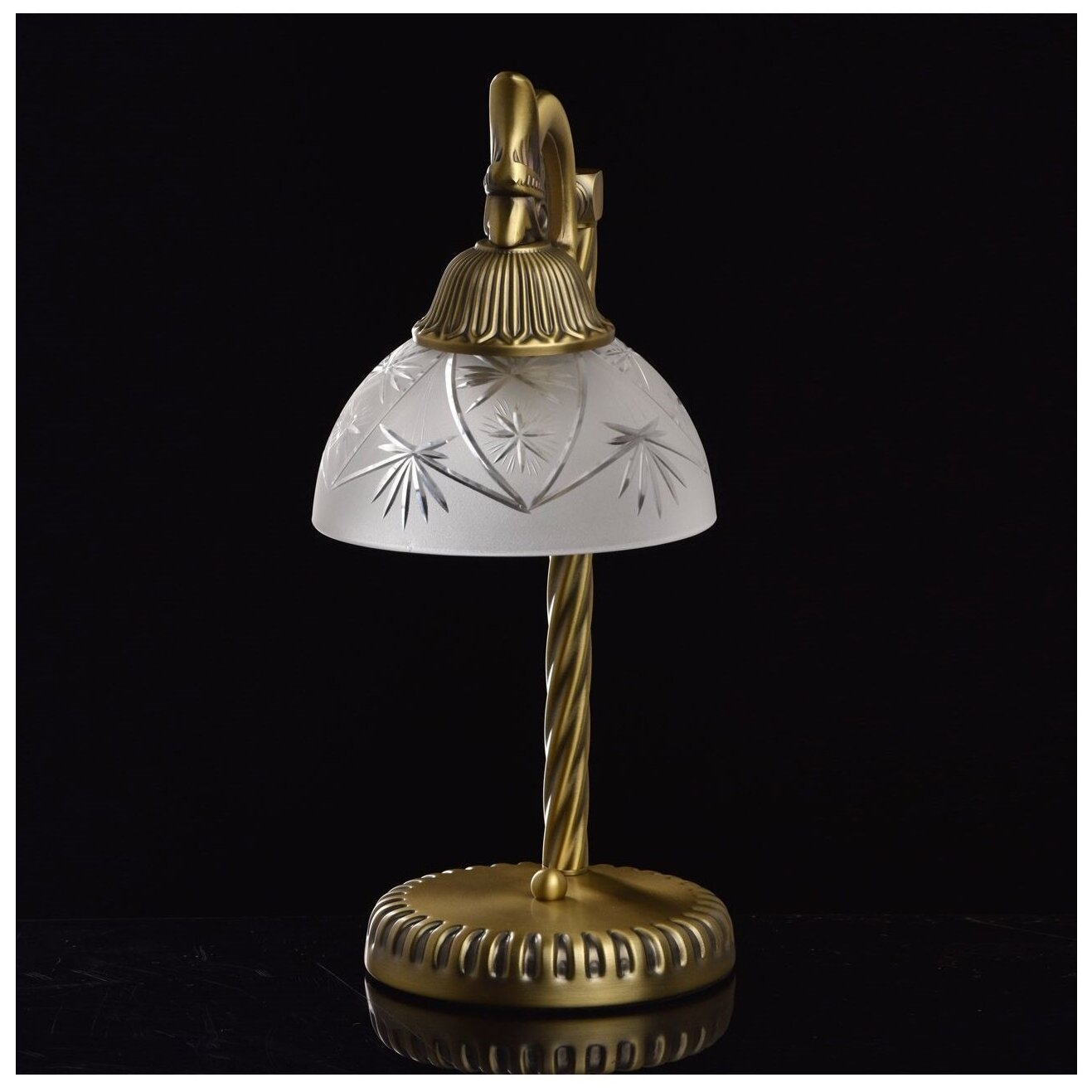 Основание и стержень настольной лампы выполнена из сплава железа и гальванизированы в цвет античной бронзы с эффектом патинирования. Стержень выполнен по технологии твист. Рожок выполнен из сплава алюминия по технологии художественного литья. Плафон изготовлен из прозрачного стекла , обработанного пескоструйным матированием с рисунком нанесенным по технологии алмазной резьбы.