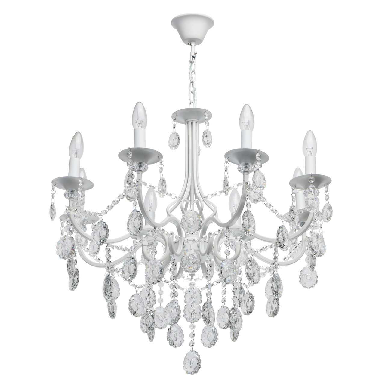 Основание светильника выполнено из металла и окрашено в белый цвет. Светильник декорирован прозрачным хрусталем оригинальной формы.