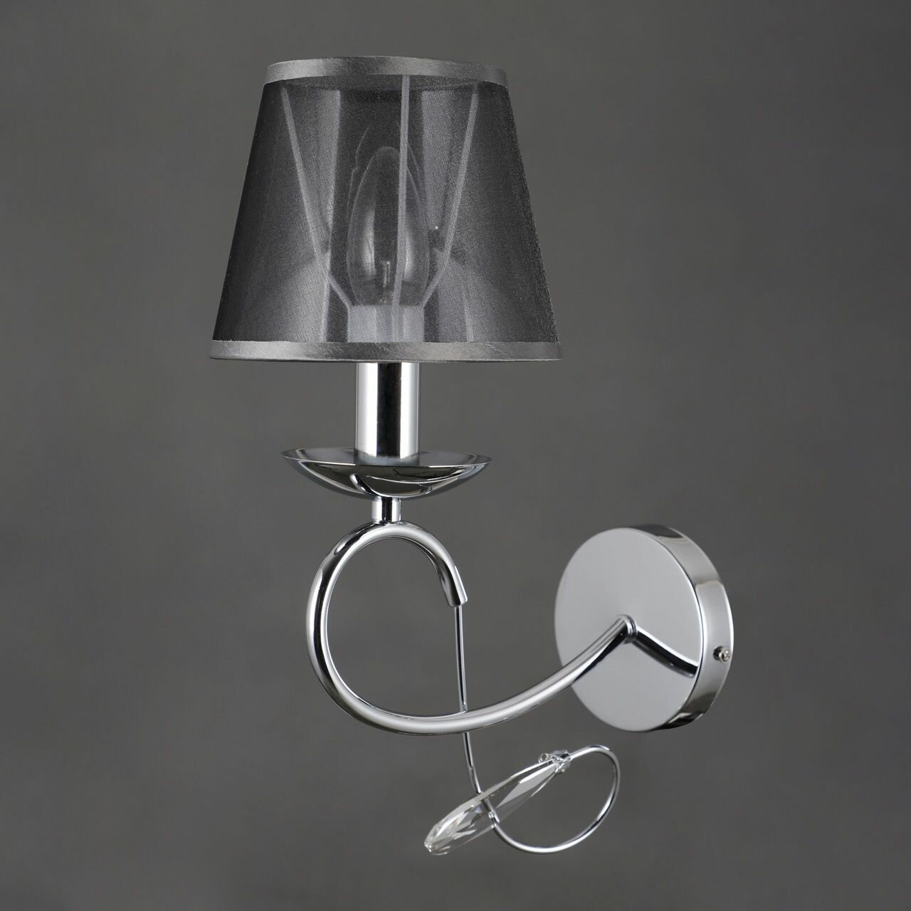 Металлическое основание бра гальванизировано в цвет хрома. Светильник декорирован двойным текстильным абажуром из органзы черного цвета с термостойким акрилом внутри. Декоративный элемент венчается прозрачным хрусталем вытянутой формы.