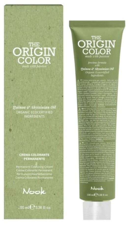Профессиональный краситель для волос, обогащенный эко-сертифицированным экстрактом киноа и абиссинским маслом. Краситель используется исключительно в смеси с активаторами Nook Activator и сервисными препаратами Nook Service Color.