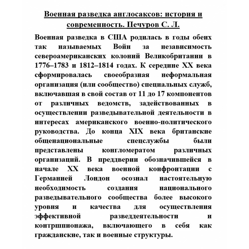 Великолепная книга генерал-майор запаса, доктор военных наук Сергея Леонидовича Печурова "Военная разведка англосаксов. История и современность". Предупреждаю сразу, это не альманах или хронология операций американской и британской военных разведок с момента их создания и до наших дней. Это уникальная монография на тему создание и развитие органов военной разведки англосаксов.