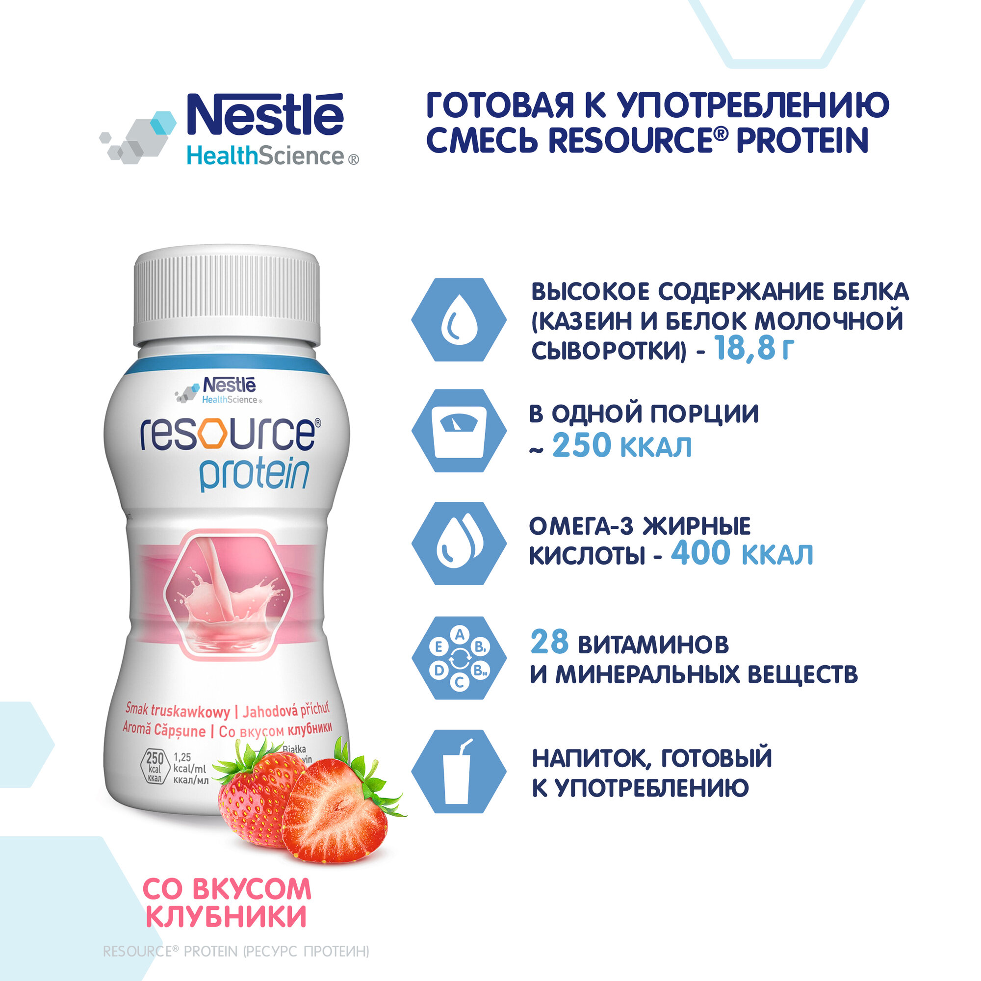 Смесь Ресурс Протеин – вкусное полноценное сбалансированное высокобелковое питание для восстановления сил для взрослых.Обеспечивает организм белком высокого качества, сбалансирован по составу белков, жиров и углеводов. Содержит Омега-3 и Омега-6 жирные кислоты, 14 витаминов и 13 минералов. Полноценный по составу продукт, компенсирует дефицит белка, витаминов и минералов. Готовый к употреблению напиток у удобном формате бутылочки 200 мл. Разработан нутрициологами компании Nestle в Швейцарии.Представлен в трех вкусах: ваниль, шоколад, клубника.