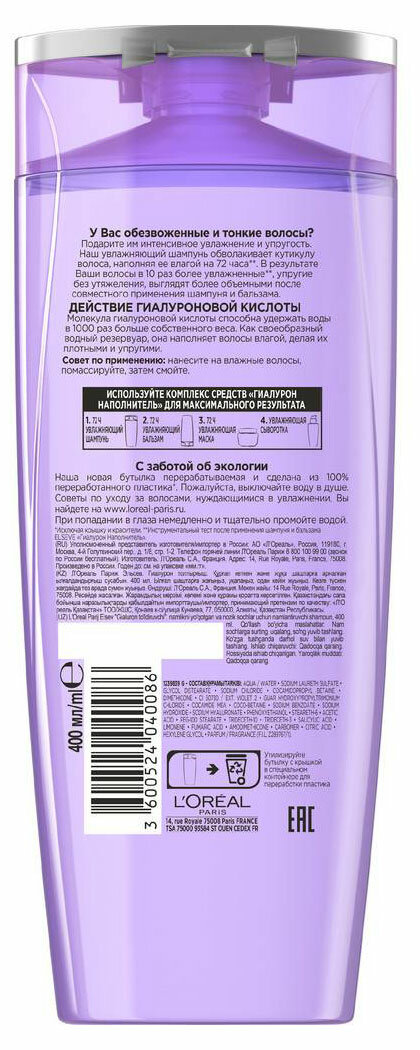 Loreal Paris Увлажняющий шампунь для обезвоженных и тонких волос с гиалуроновой кислотой 400 мл (Loreal Paris ) (ЭХ99989427950)