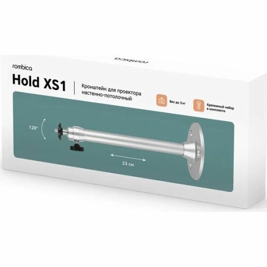 Универсальный подвес для видеопроектора Rombica подходит для монтажа на стену и потолок. Диаметр его резьбы составляет 6 мм. Подвес выдерживает до 3 кг нагрузки. Он изготовлен из комбинированных материалов: металла и пластика. Угол наклона можно регулировать в диапазоне 120°.
