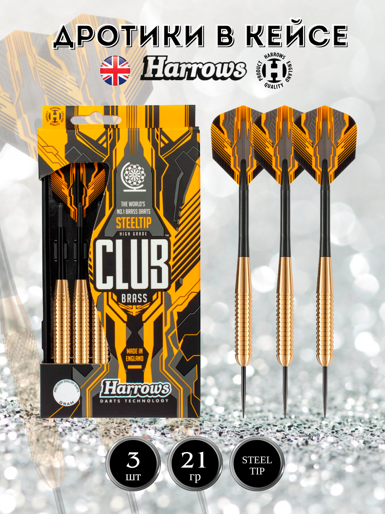 Профессиональные дротики Club Brass. В упаковке 3 шт. Вес одного дротика 16, 18, 20, 21, 22, 23, 24, 26 гр. Дротик состоит из баррели, наконечника, а также хвостовика и оперенья. Барелль дротиков HARROWS Club Brass выполнена из хромированной латуни. В комплект входят 3 дротика, пойнт-гуард держатель и пластиковый кейс для транспортировки и хранения. Дротики Harrows Club Brass softip для Электронного дартса. Дротики SOFTIP с мягкими пластиковыми иглами. STEELTIP - острые наконечники, используются для игры только на сизалевых мишенях. Материал: латунь.