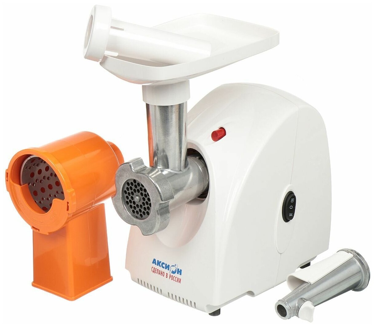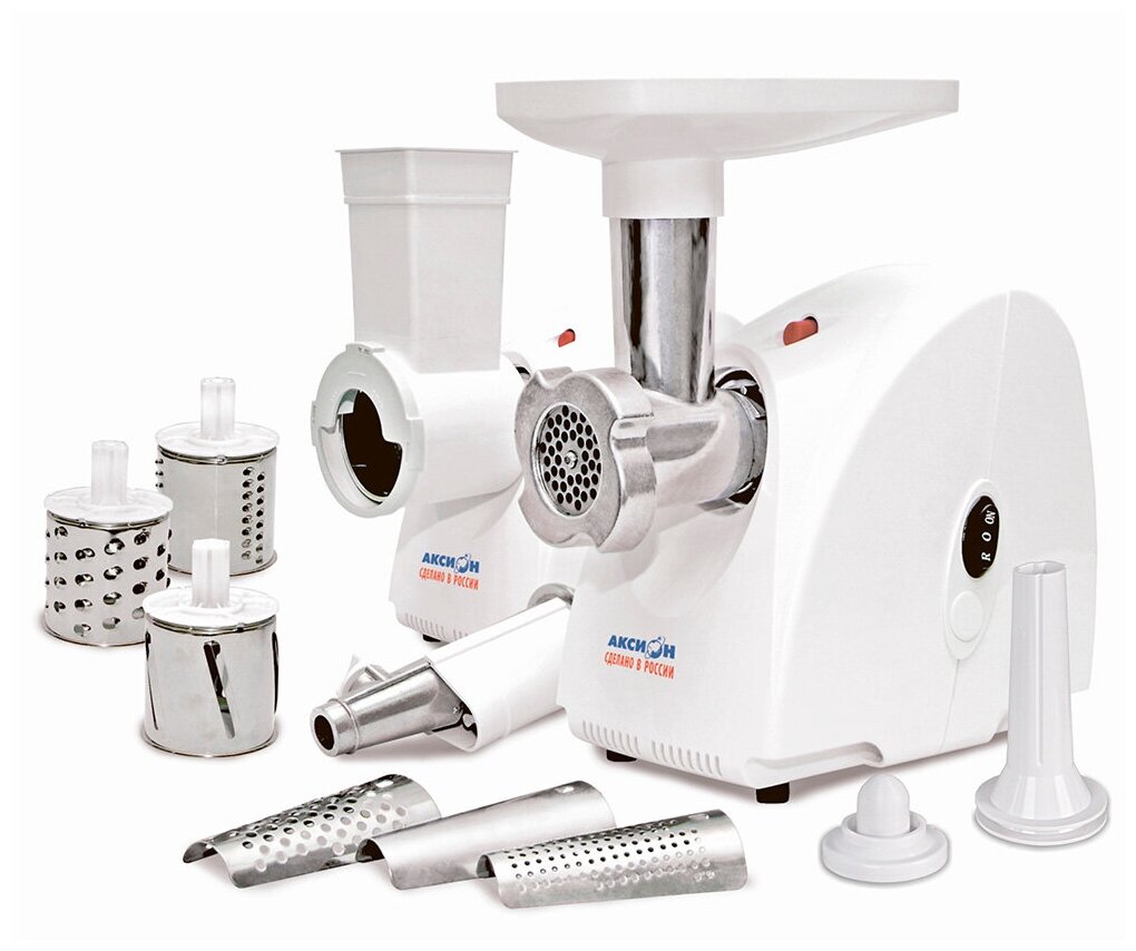 Электромясорубка Аксион М31.02 может использоваться для выполнения самых разных кухонных работ. Кроме стандартного режущего блока в комплект её поставки включены соковыжималка и овощерезка с набором сменных насадок.