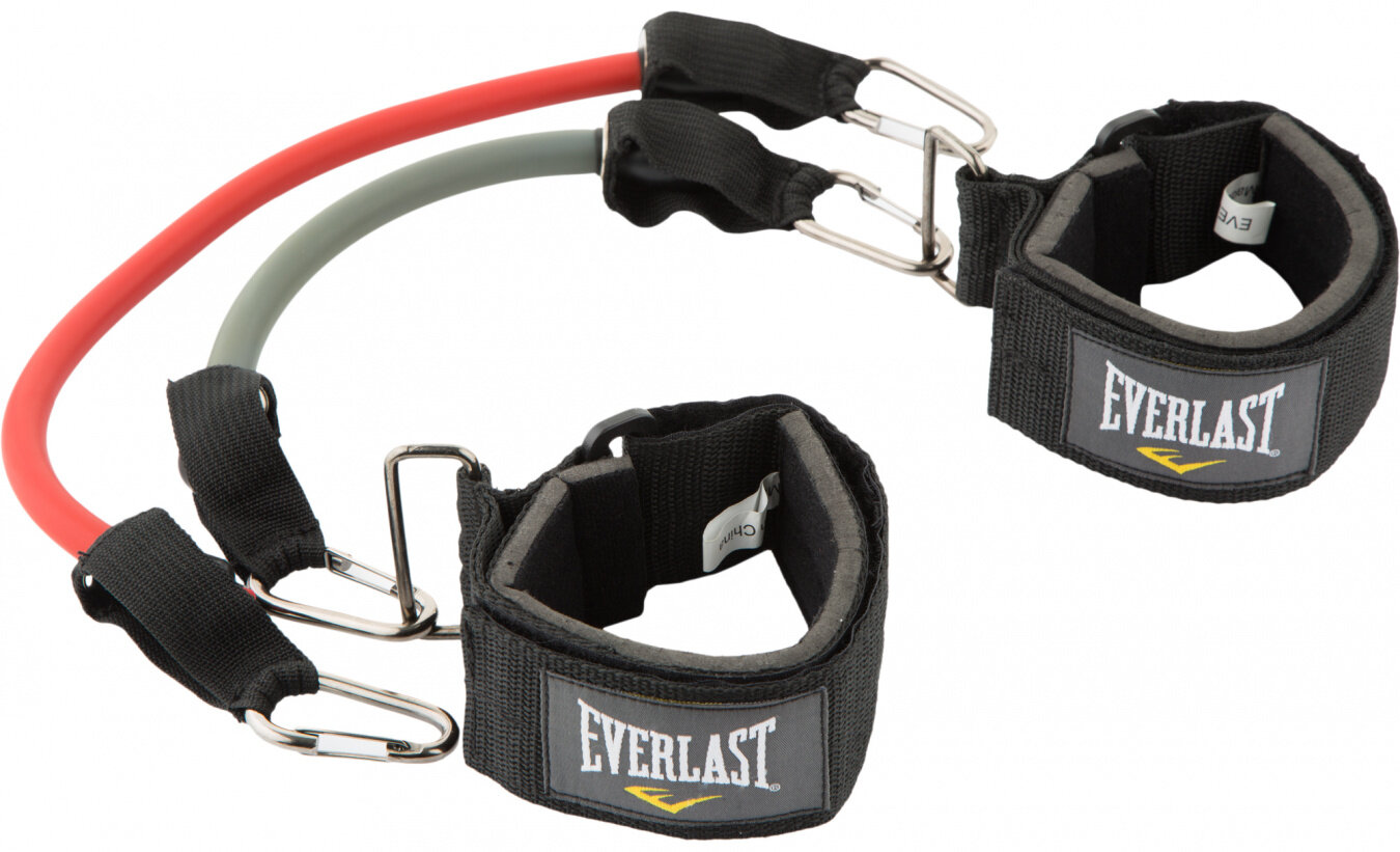 Everlast "" - эспандер для тренировки ног, который пригодится не только боксерам, но и фитнес-спортсменам. Мягкие манжеты с регулировкой длины гарантируют комфортную тренировку, а сменные жгуты позволяют варьировать нагрузку в зависимости от целей или уровня подготовки. Красный жгут обеспечивает сопротивление до 7 кг и предназначен для отработки техники ударов коленом и ногой. Серый жгут повышает сопротивление до 11 кг и идеален для того, чтобы совершенствовать стойку.