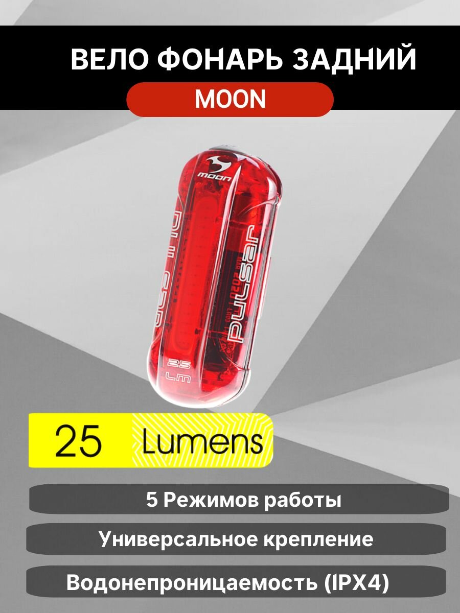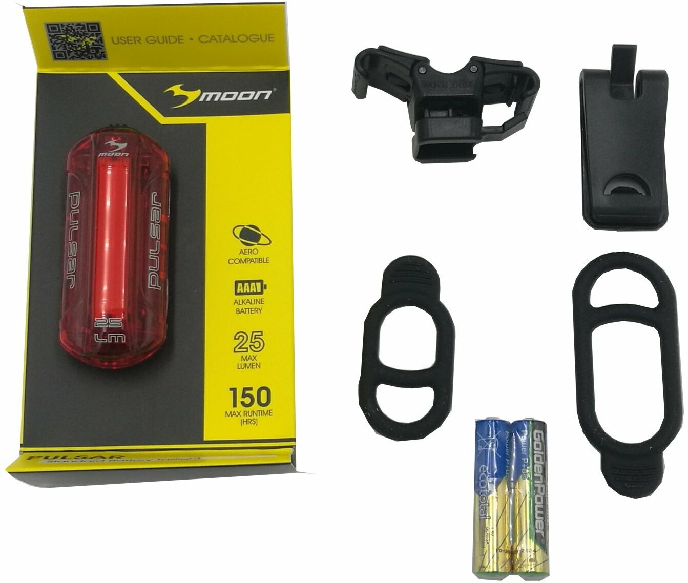 | Вводное описание | Яркий задний фонарь Moon Pulsar мощностью 25 люмен идеально подойдет для передвижения по городу. Питание от 2 батареек типа AAA. Время работы в наиболее энергоемком режиме до 45 ч. Размер 65.5x28.7x20.5 мм. Вес 38 г. |