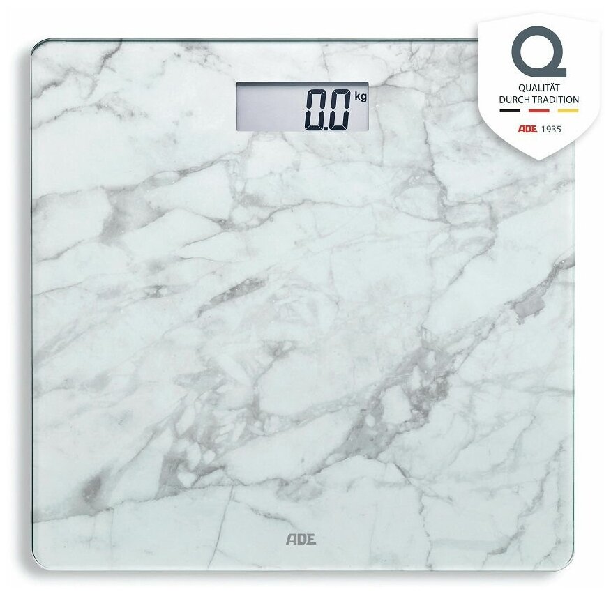 Весы ''Ade'' отвечают самым высоким требованиям к функциональности, точности, безопасности и индивидуальности. Цифровые весы для ванной комнаты. Мраморный живой тренд - элегантный дизайн в белом цвете. Поверхность для взвешивания выполнена из закаленного стекла. LCD дисплей. Единицы взвешивания: kg, lb and st. Step-on технология. Индикатор состояния перегрузки и батареи, автоматическое отключение.