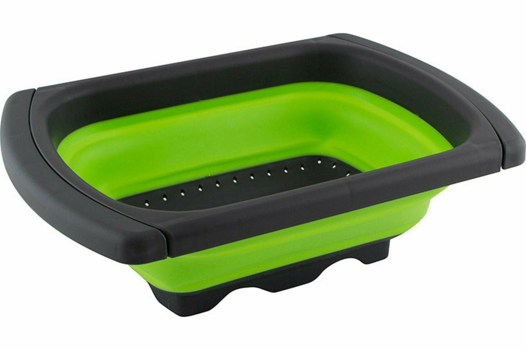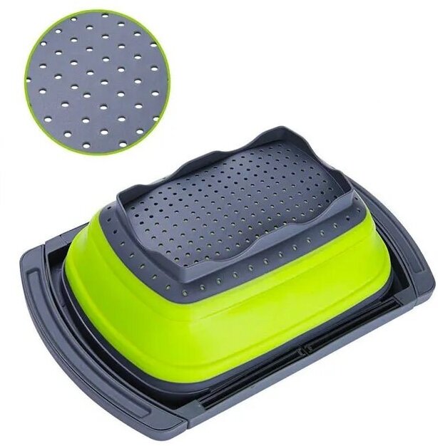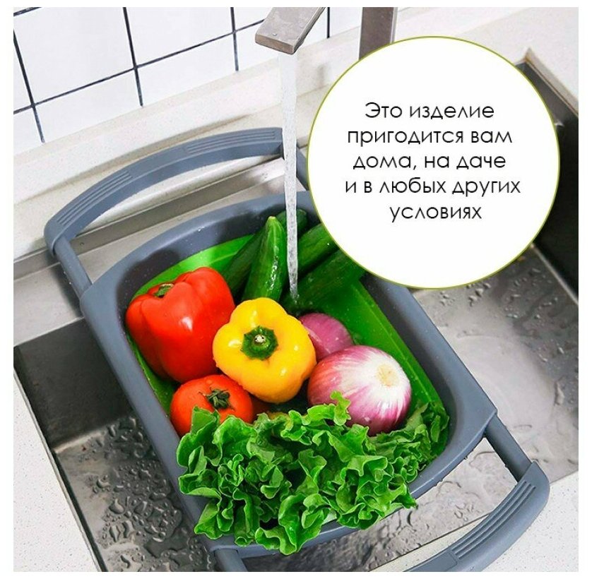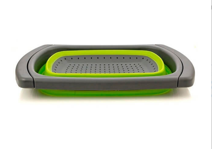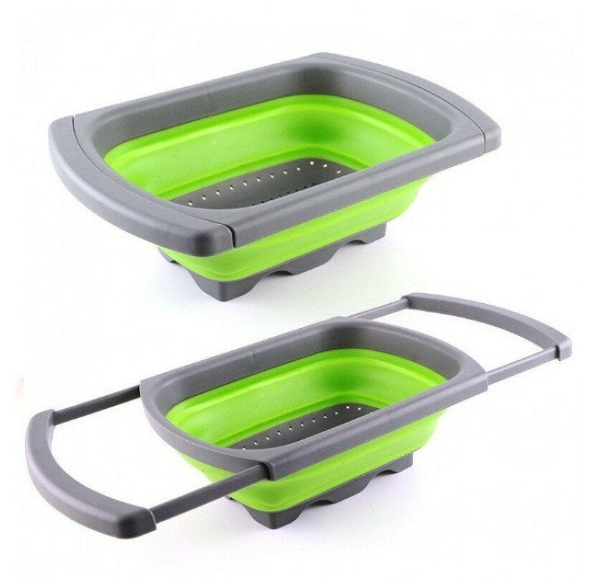 Складной дуршлаг удобно использовать, так как в отличие от обычных дуршлагов его не нужно удерживать в руках, чтобы пропустить жидкость, его возможно установить на раковину. Еще одним достоинством является компактное хранение.