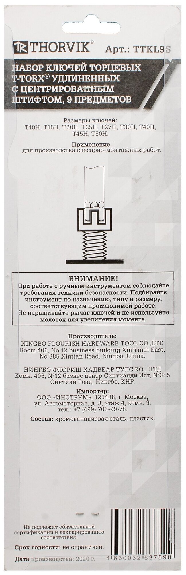 | Дополнительно | Набор из 9 предметов Т-Torx удлиненных ключей. СоставТ10, Т15, Т20, Т25, Т27, Т30, Т40, Т45, Т50. Длина ключа (в зависимости от типо-размера от 93 до 231 мм). |