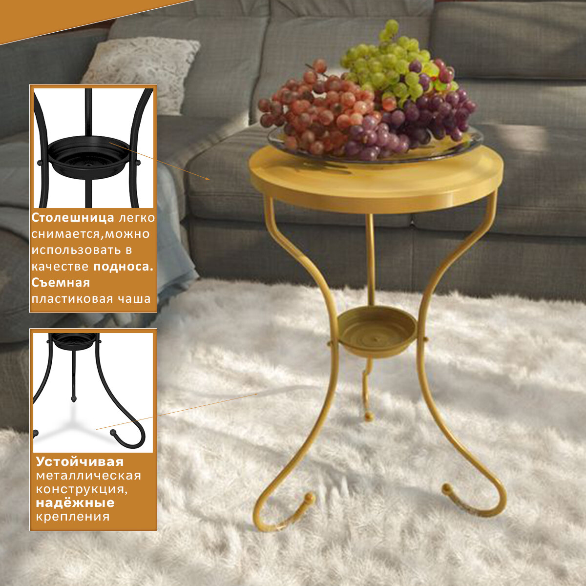 Диаметр столешницы - 350 мм.Каркас выполнен из трубы диаметром 10 мм.Максимальная статическая нагрузка на столик 5 кг.