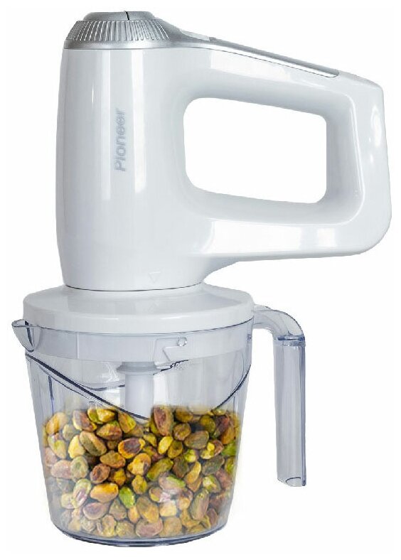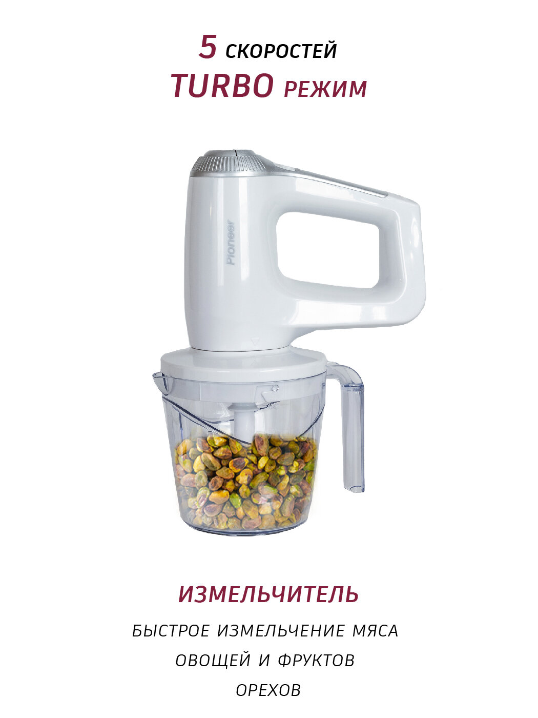 Многофункциональный блендер миксер Pioneer HB125S 4 в 1 поможет в приготовлении супов, вторых блюд, салатов, соусов, выпечки и десертов, зимних заготовок и других ваших любимых блюд. Процесс станет быстрым и приятным. Блендер измельчитель с чашей и насадками является незаменимой вещью для тех, кто вынужден придерживаться диетического питания из-за проблем с ЖКТ, для приготовления детского питания и людей старшего возраста, которым иногда трудно пережевывать жесткую пищу. Ключевые характеристики: электрический; максимальная мощность: 500 Вт; 5 скоростей; режим турбо. Области применения: замес теста; взбивание яиц; смешивание различных продуктов для приготовления соусов, супов, майонеза; измельчение мяса, лука, чеснока, орехов, для приготовления коктейлей и смузи. Особенности И преимущества: cтильный дизайн; корпус из высококачественного ABS пластика, устойчивого к влаге и появлению царапин; эргономичная ручка; регулировка скорости; кнопка снятия насадок; простота использования; легкая очистка; удобство хранения. Оснащение: насадка блендер из нержавеющей стали; венчики для взбивания из нержавеющей стали; крючки для замеса теста из нержавеющей стали; измельчитель с ручкой объемом 1 литр. Надежный, стильный и качественный ручной блендер измельчитель 4 в 1 от Pioneer станет незаменимым помощником на вашей кухне. Комплектация: миксер, насадка-блендер, венчики для взбивания, крючки для замеса теста, измельчитель, инструкция с гарантийным талоном. Также вы сможете найти наш блендер по комбинации следующих слов в поисковом запросе: блендер стационарный, блендер 3 в 1, блендер погружной мощный.