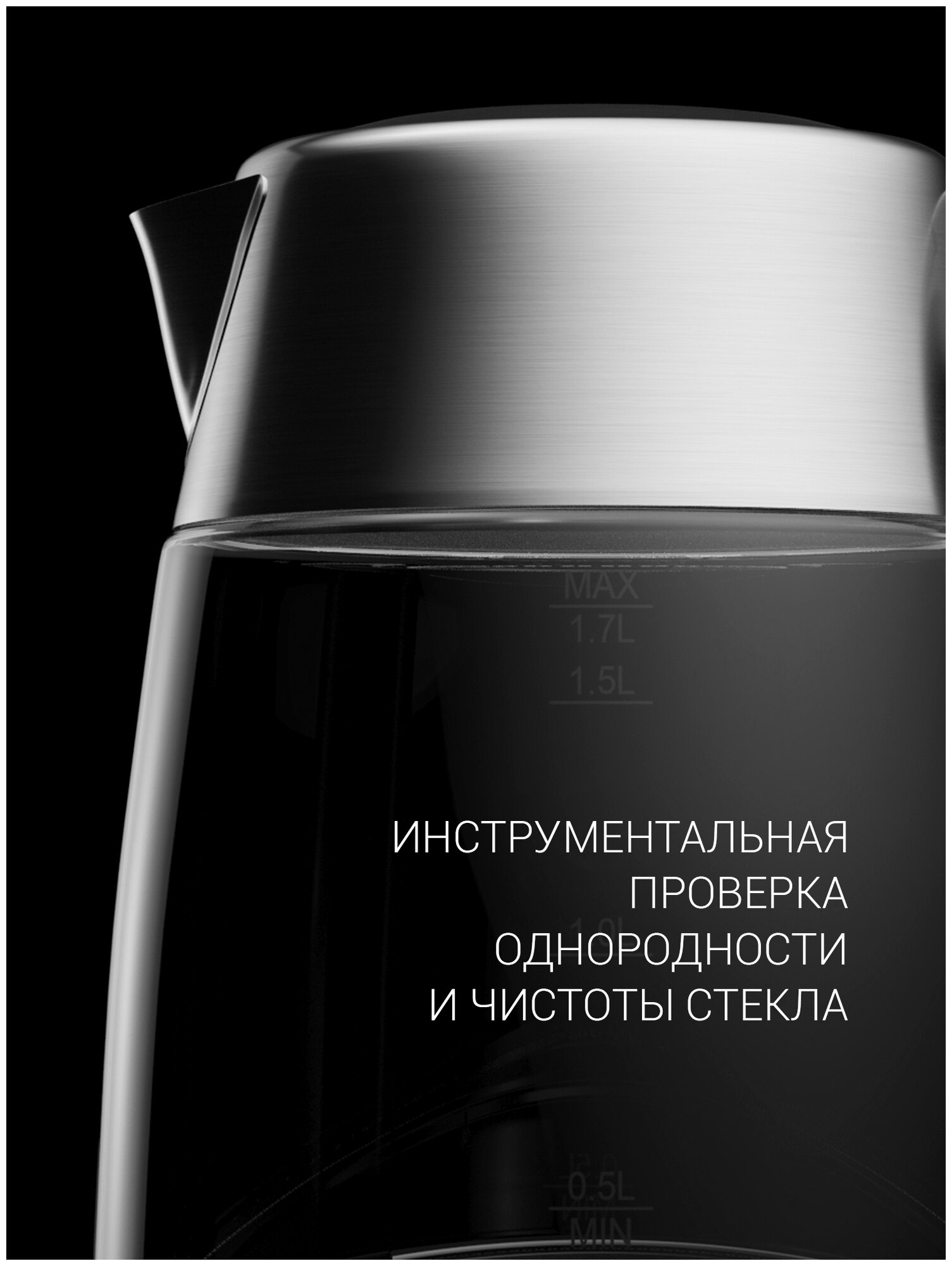 Английский контроллер ''Strix'': 15 000 циклов кипячения, что равно 10 годам интенсивного использования. Яркая внутренняя подсветка. Корпус из высококачественного термостойкого стекла. Инструментальная проверка однородности и чистоты стекла. Функция поддержания заданной температуры воды. Возможность выбора температуры от 40° до 100°. ЖК-дисплей с подсветкой и сенсорная панель управления. Открытие крышки на 90° способствует легкой очистке чайника и удобному заливу воды. Блокировка включения без воды.
