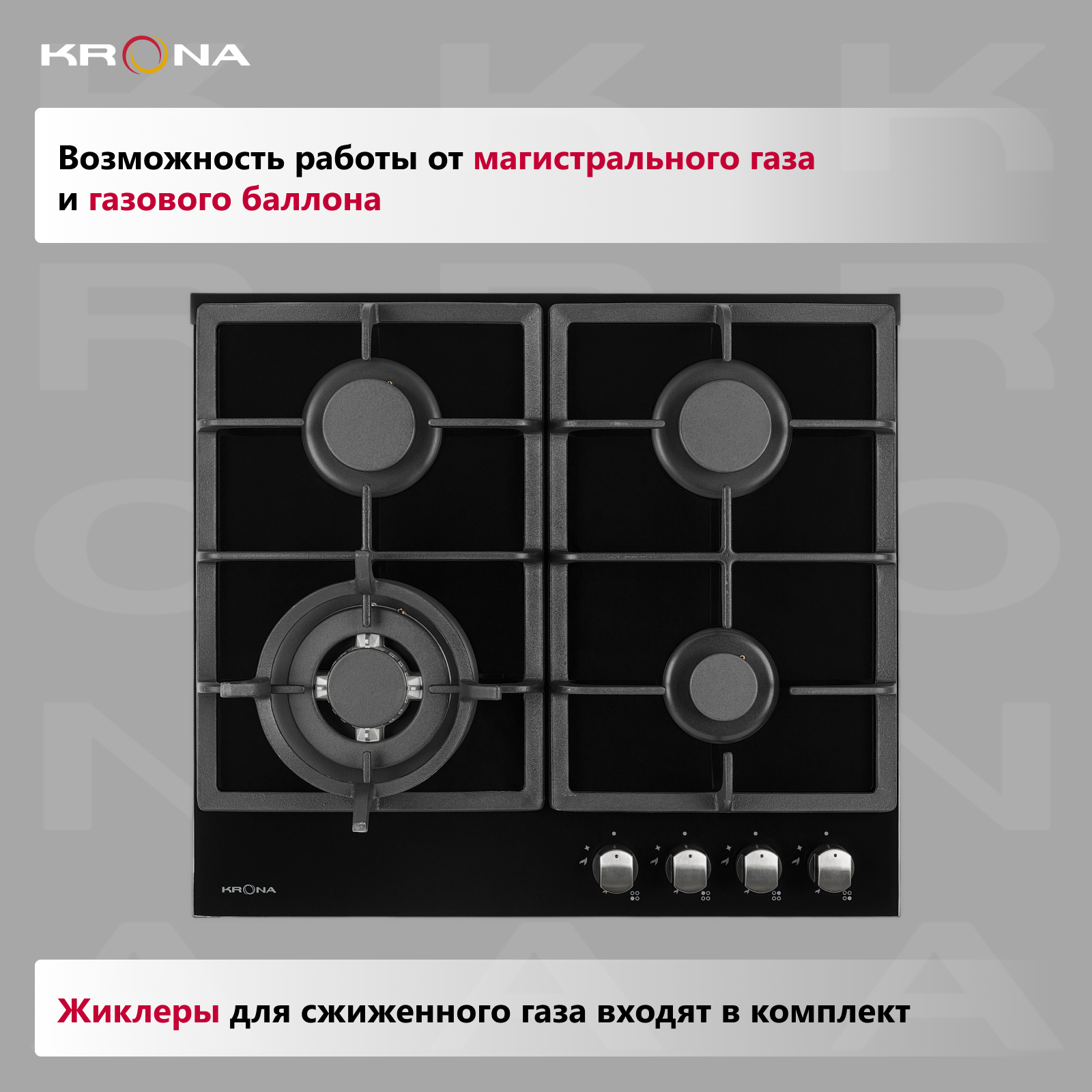 Варочная панель Krona Armonia 60 BL выполнена из закаленного черного стекла толщиной в 8 мм, которое отличается высокой степенью прочности и легкостью в уходе. Эта модель может работать от природного и сжиженного газа (жиклеры идут в комплекте).