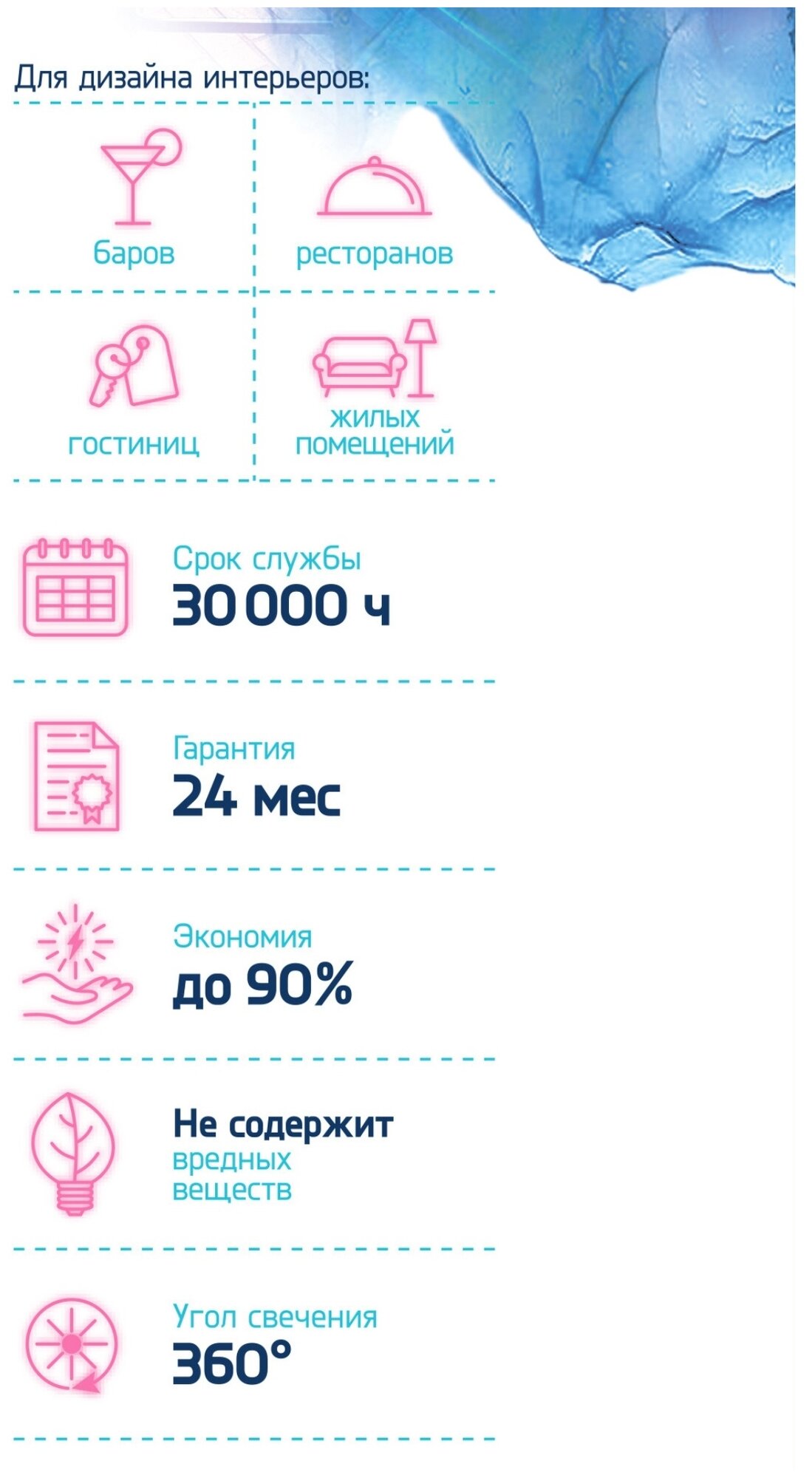 Цветовая температура 3500 К создает комфортную атмосферу при естественном свечении.