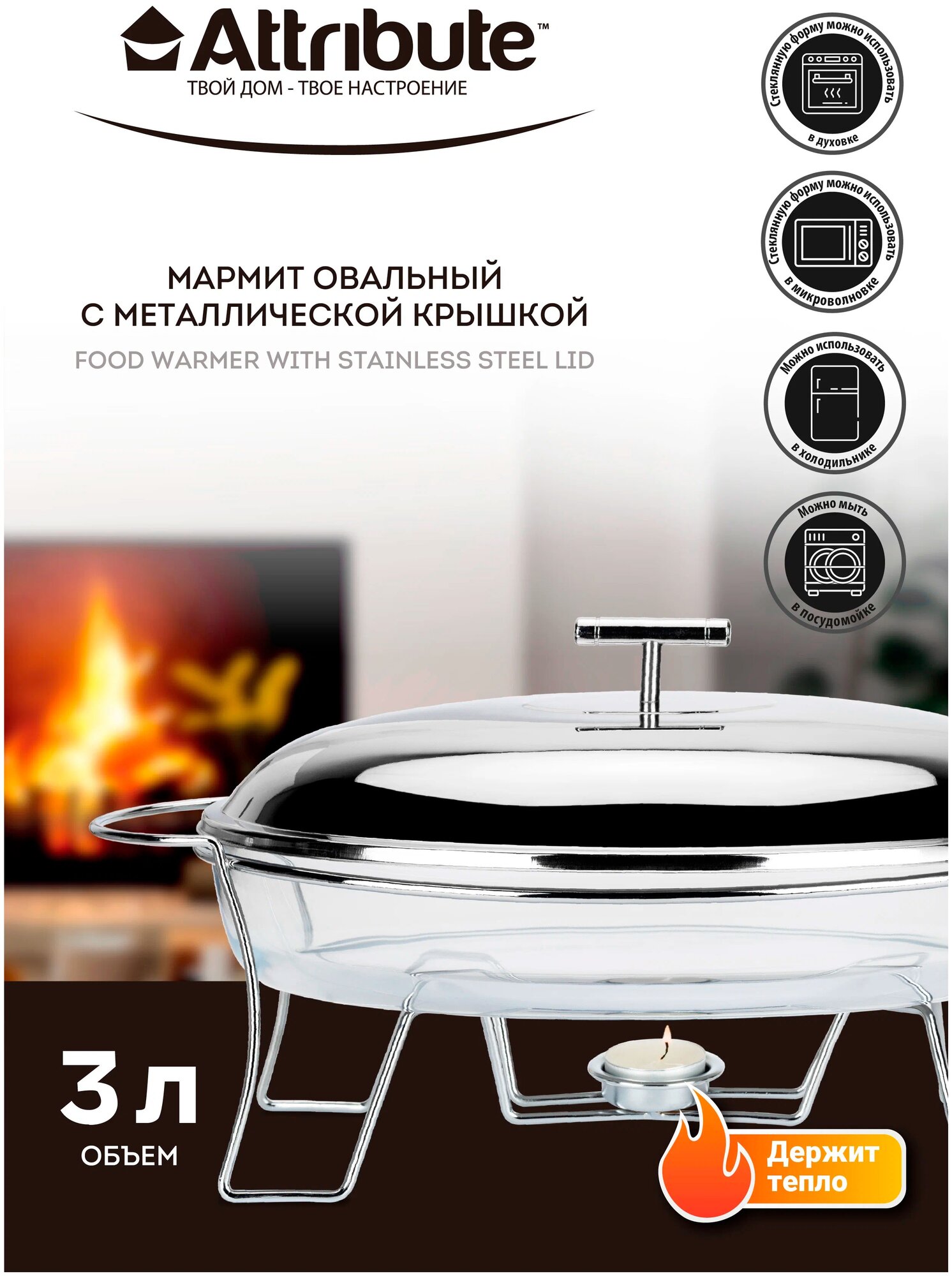 Мармит на подставке и со свечами ''Invite'' 3 л овальный с подогревом на стол для вторых горячих блюд мяса птицы рыбы овощей риса картошки для кухни. Блюдо с подогревом мармит из жаропрочного стекла способен выдерживать температуры от - 40°С до +300°С. Благодаря чему его можно использовать, как форму для запекания - как в микроволновых печах и духовках, так и в холодильниках и морозильных камерах. Крышка из высококачественной нержавеющей стали 201, подставка из хромированной стали. Безусловным достоинством жаропрочного мармита из стекла является его абсолютная экологическая нейтральность и безопасность для здоровья человека. Благодаря идеально гладким стенкам жаропрочный мармит не впитывает ни жир, ни вкусы, ни запахи продуктов даже рыбы. В подарок идет 1 свеча. Купить мармит можно как хороший подарок на любой повод.