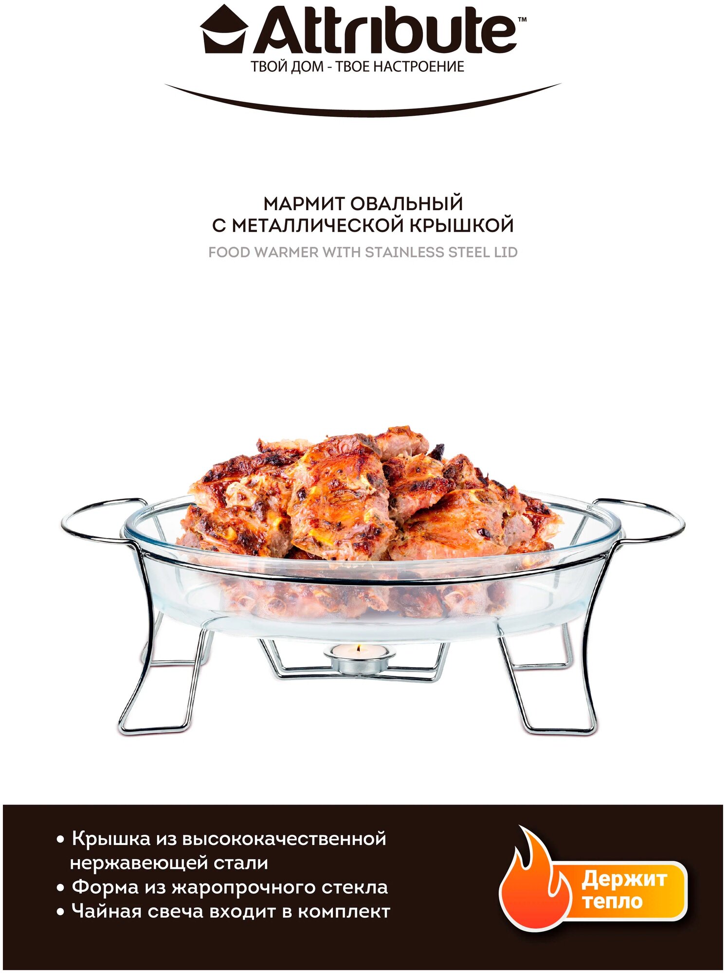 мармит ATTRIBUTE Invite 3л 44x245x165см овальный боросиликатное стекло нержавеющая сталь (ABI010)