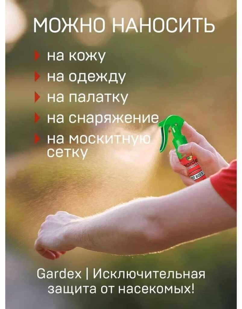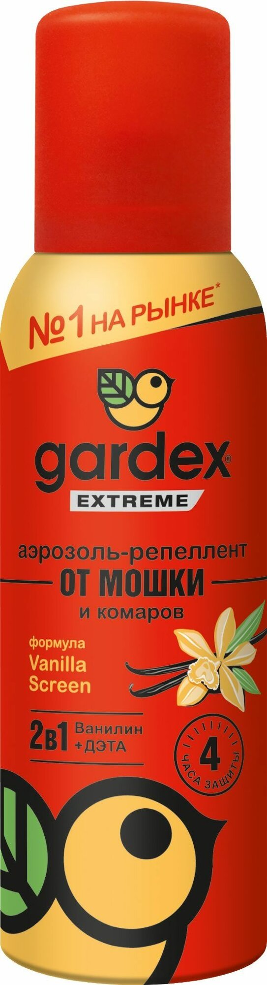 Этот аэрозоль-репеллент содержит инновационную формулу Vanilla Screen: действующее вещество средства усилено ванилином, который является природным веществом, отпугивающим мошек. Это позволяет аэрозолю Gardex Extreme обеспечивать надежную защиту от мошки, комаров, мокрецов, слепней, москитов. Средство от комаров и мошки действует до 4 часов после нанесения на открытые участки кожи и до 20 суток при нанесении на одежду или снаряжение из натуральных тканей.
