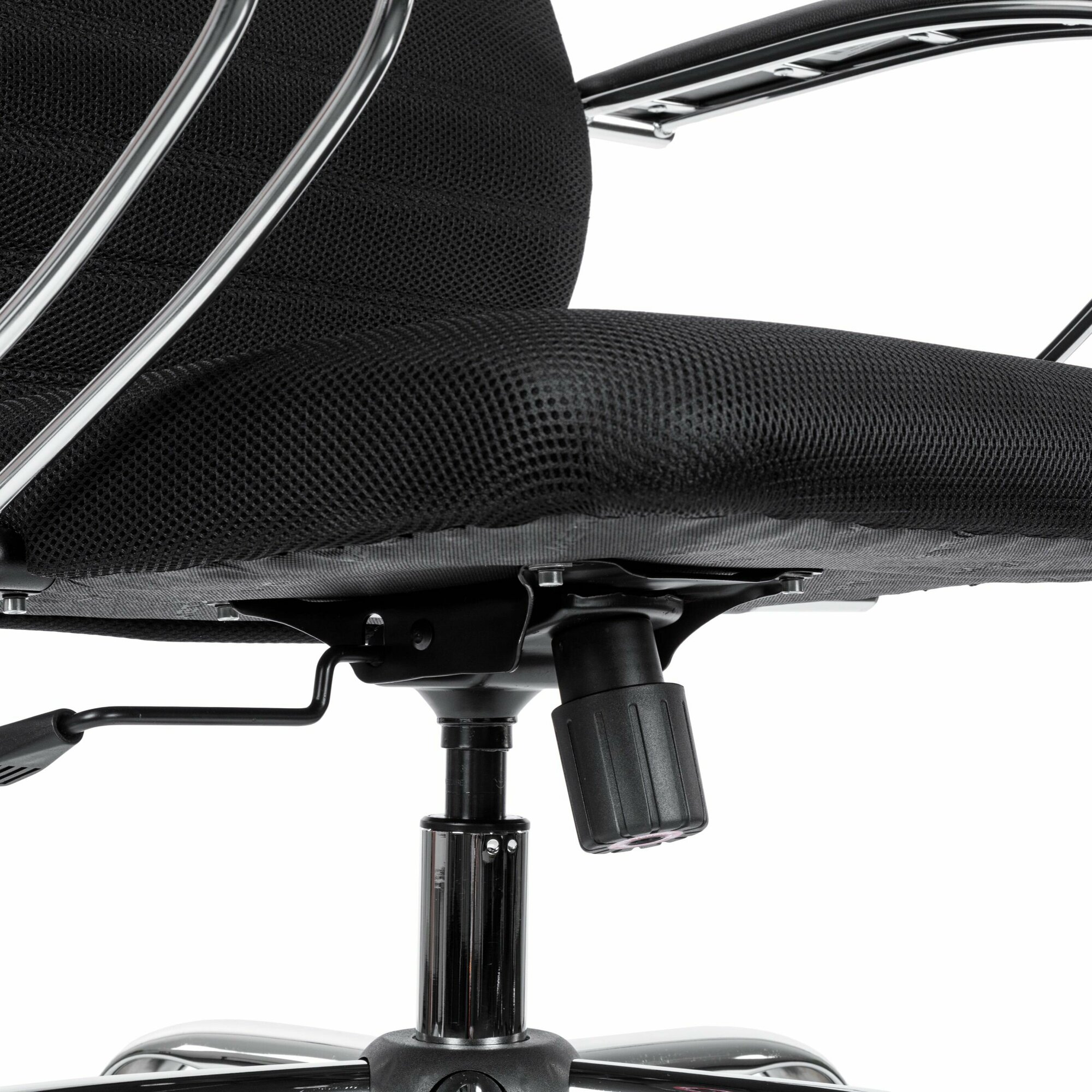 Спинка: высокая с мягким подголовником, черное полимерное покрытие каркаса. Высота: 860 мм. Ширина: 475 мм. Вид обивки спинки: износостойкая ткань обивочная сетчатая многослойная (тонкая двойная прошивка), натяжная (поверх каркаса). Спинка комплектуется дополнительной подушкой, позволяющей увеличить объем подголовника. Подлокотники: стальные классические, хромированные с мягками накладками. Сиденье: мягкое обьемное на столярном каркасе. Ширина: 475 мм. Вид обивки сиденья: износостойкая ткань обивочная сетчатая без прошивки. Материалы обивки: экокожа MPRU на подголовнике, на подлокотниках. Механизм качания: топган. Пятилучье: стальное хромированное с овальным сечением лучей. Диаметр: 700 мм. Газлифт: стальной хромированный. Ролики: полиамидные. Диаметр роликов: 50 мм.
