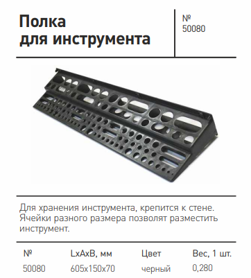 Полка для инструмента Дельта 50080Ц представляет собой удобное и практичное решение для организации рабочего пространства. Изготовленная из прочного пластика, она обеспечивает долговечность и надежность, а яркая красная поверхность придает стильный и современный вид.Размеры полки составляют 605х150х70 мм, что позволяет разместить на ней большое количество инструментов. Благодаря ячейкам разного размера, инструменты можно разместить максимально удобно и эффективно использовать пространство полки.Полка крепится на стену с помощью саморезов, что обеспечивает надежное и прочное крепление. Вес полки всего 0,28 кг, что делает ее легкой и удобной в использовании.Компактные размеры полки позволяют сэкономить пространство в мастерской или гараже, при этом сохраняя порядок и удобство хранения инструментов.Выбирая полку для инструмента настенную пластиковую Дельта 50080Ц, вы получаете надежное и удобное решение для хранения инструментов, которое поможет поддерживать порядок и эффективность работы.