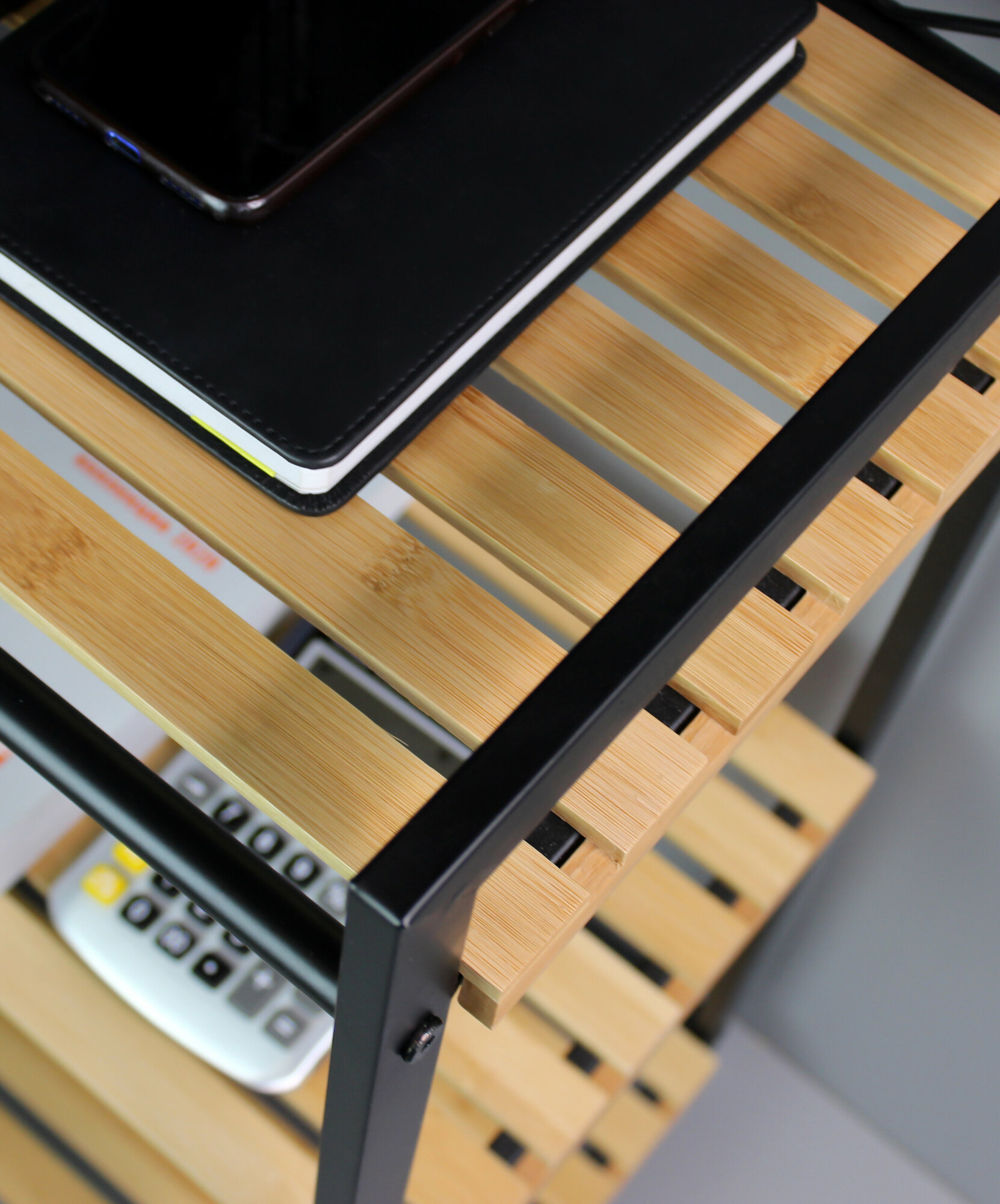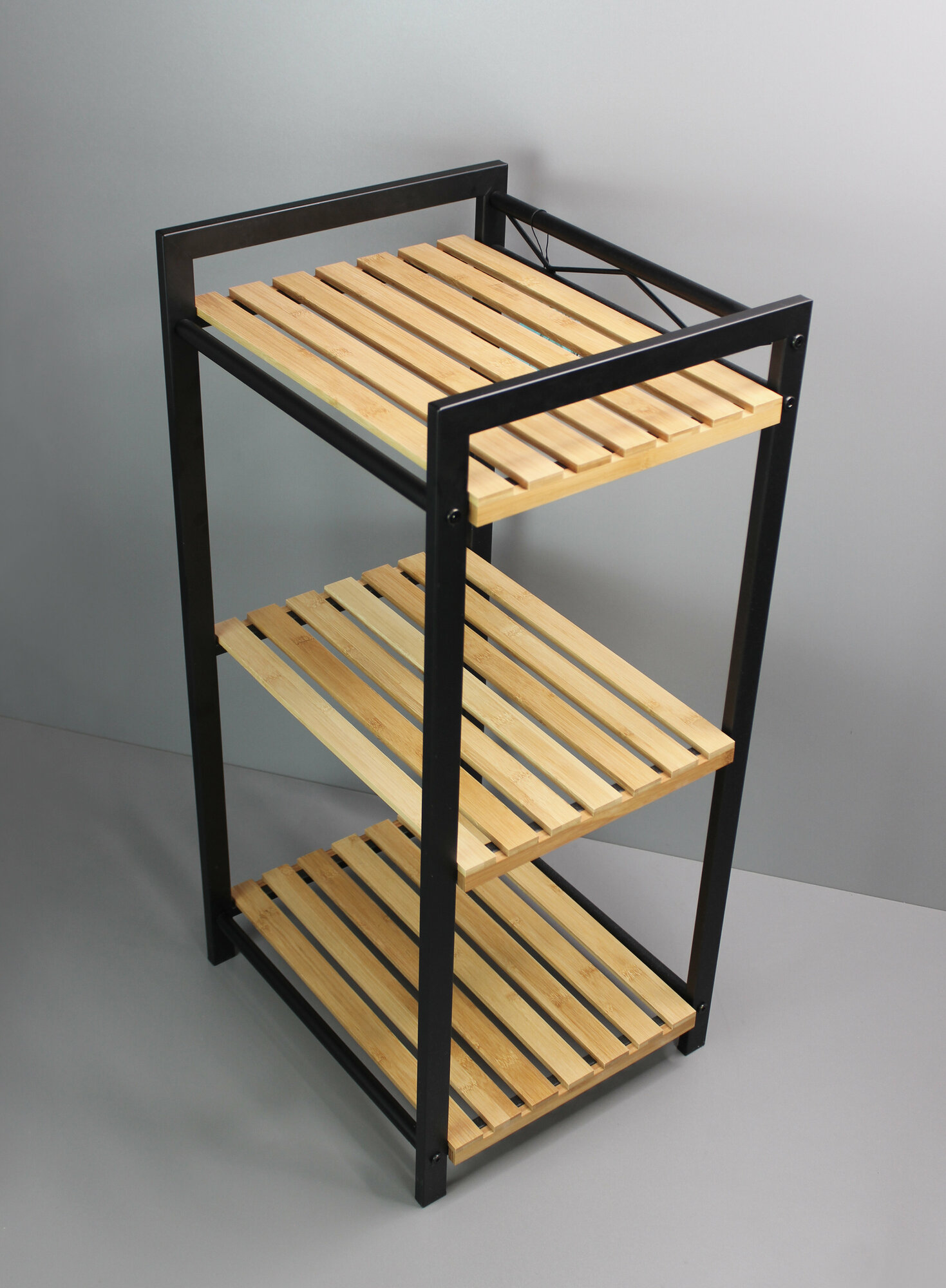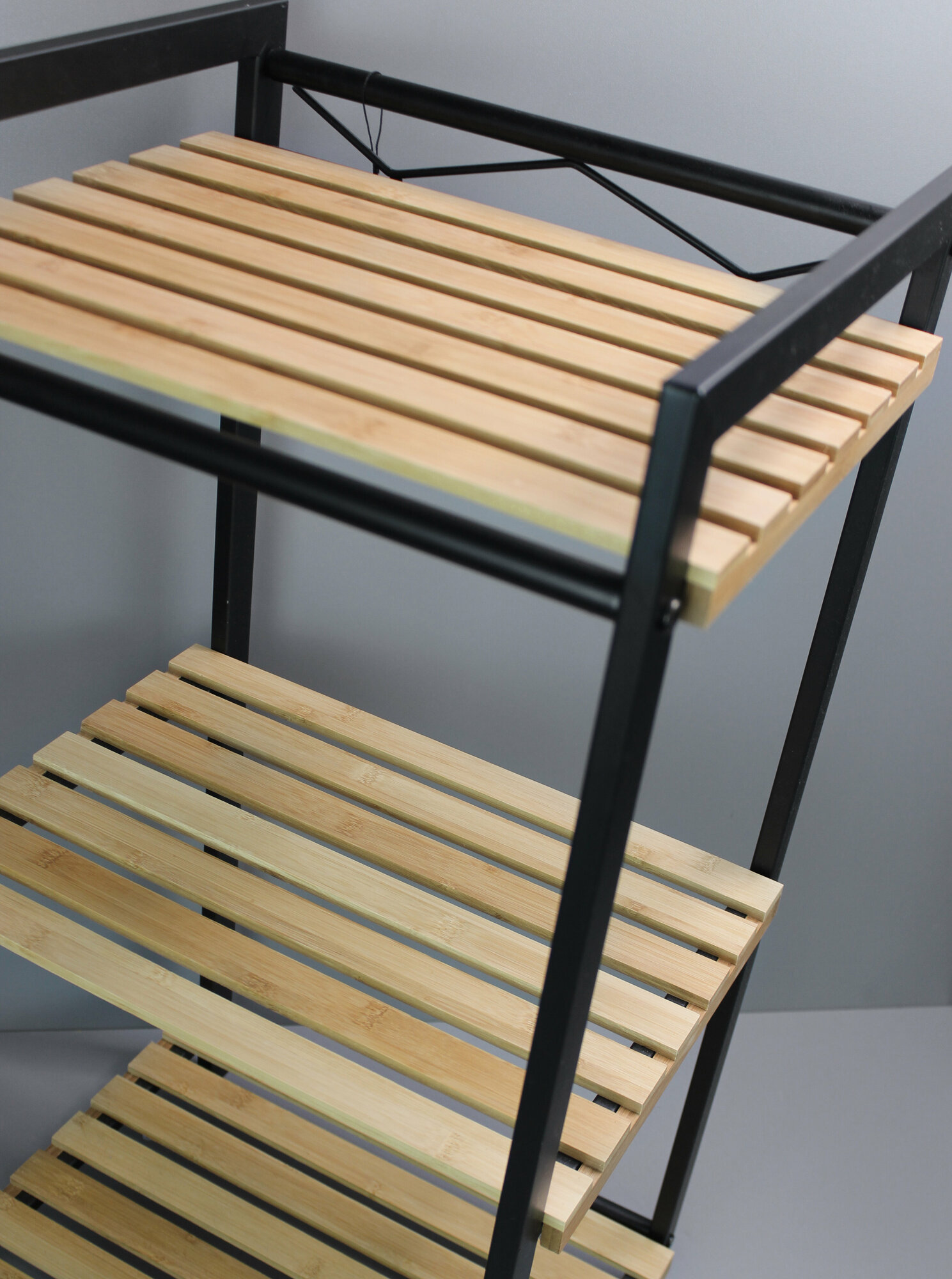 Компактный металлический стеллаж с тремя полками из бамбука. Высота 78 мм, ширина 38 см. Бамбуковые полки не крепятся на изделие, легко снимаются. Можно использовать как дополнение к основному столу, а также как стойку для мелочей на кухню, как полку для книг и разных мелочей в гостиную. Универсальная модель может использоваться в любых целях. Нагрузка на каждую полку составляет до 5 кг. Модель черного цвета отлично впишется в любой интерьер. Обращаем ваше внимание, что бамбуковые изделия не предназначены для длительного контакта с водой. Также при их использовании недопустим контакт с агрессивными химическими веществами и абразивными средствами.