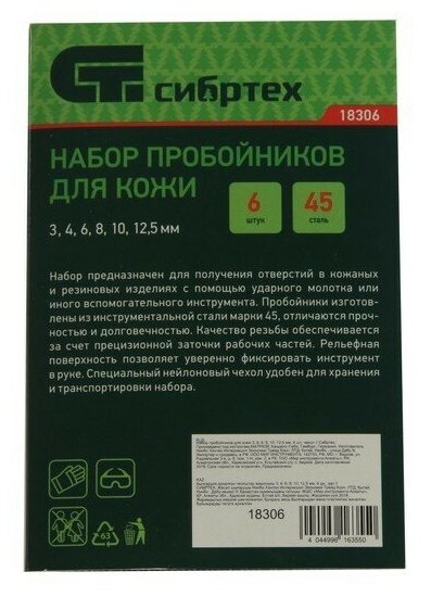 Набор предназначен для изготовления отверстий в кожаных и резиновых изделиях с помощью ударного молотка или иного вспомогательного оборудования.Пробойники изготовлены из инструментальной стали марки 45, отличаются прочностью и долговечностью.Качество и ровность резьбы обеспечиваются за счет прецизионной заточки рабочих частей.Рельефная поверхность позволяет уверенно фиксировать инструмент в руках.Специальный нейлоновый чехол удобен для хранения и транспортировки набора.