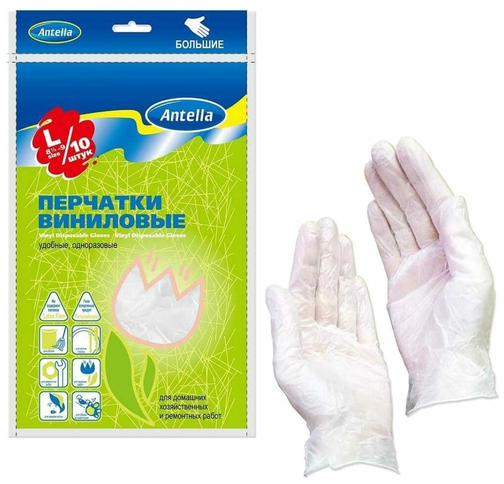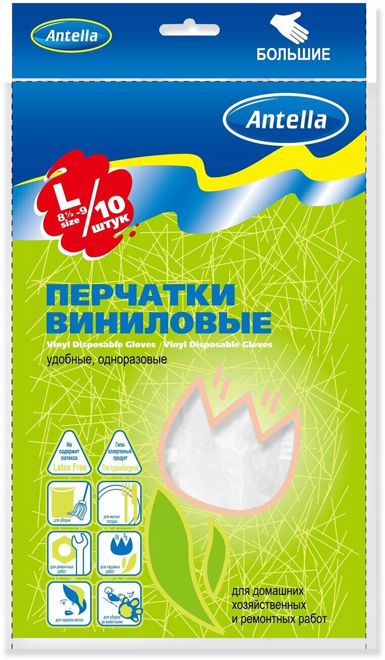 Виниловые перчатки ANTELLA 10 шт, р. L изготовлены из специального исключительно эластичного и прочного материала - винила. Материал не имеет запаха и является гипоаллергенным.Для удобства использования одна перчатка подходит для обеих ладоней.Перчатки водонепроницаемые, хорошо прилегают к руке. Имеют дополнительны валик (рант), позволяющий защищать руки от попадания жидкости и грязи на поверхность ладоней.