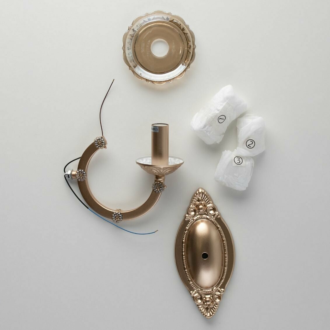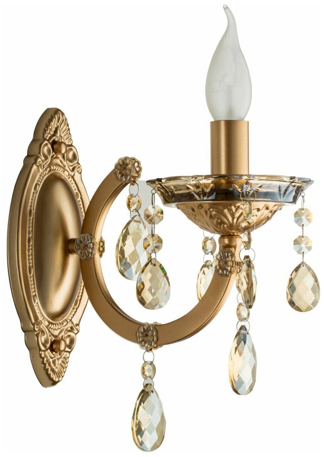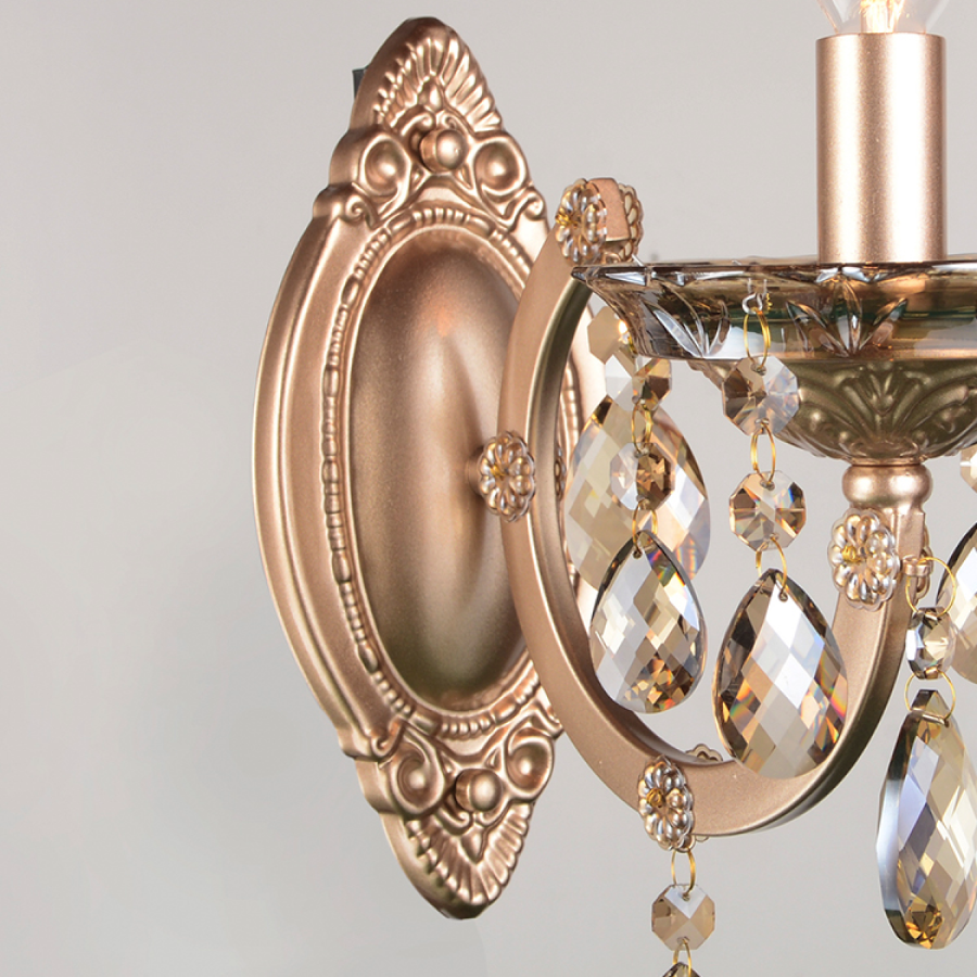 Основной материал — окрашенный металл, дополнительный — стекло. Цвет — глянцевый золотой. К светильнику подходят лампы мощностью до 40 Вт с цоколем E14. Для крепления на стене используется скоба. Класс электробезопасности 1: электроприбор с обязательным заземлением.