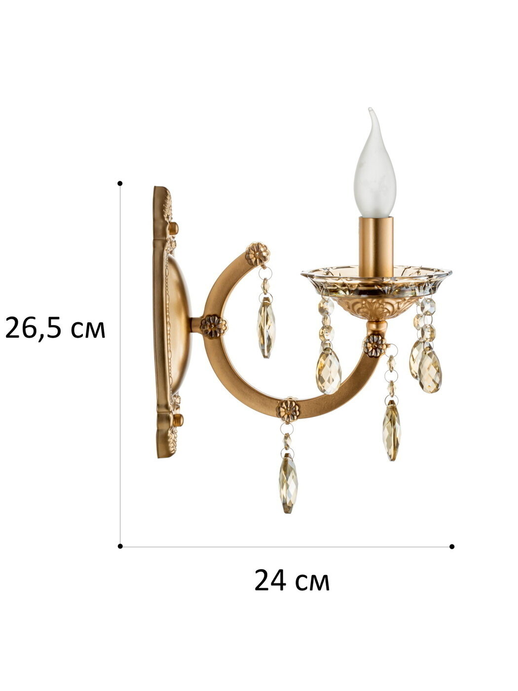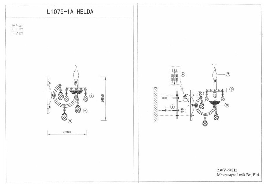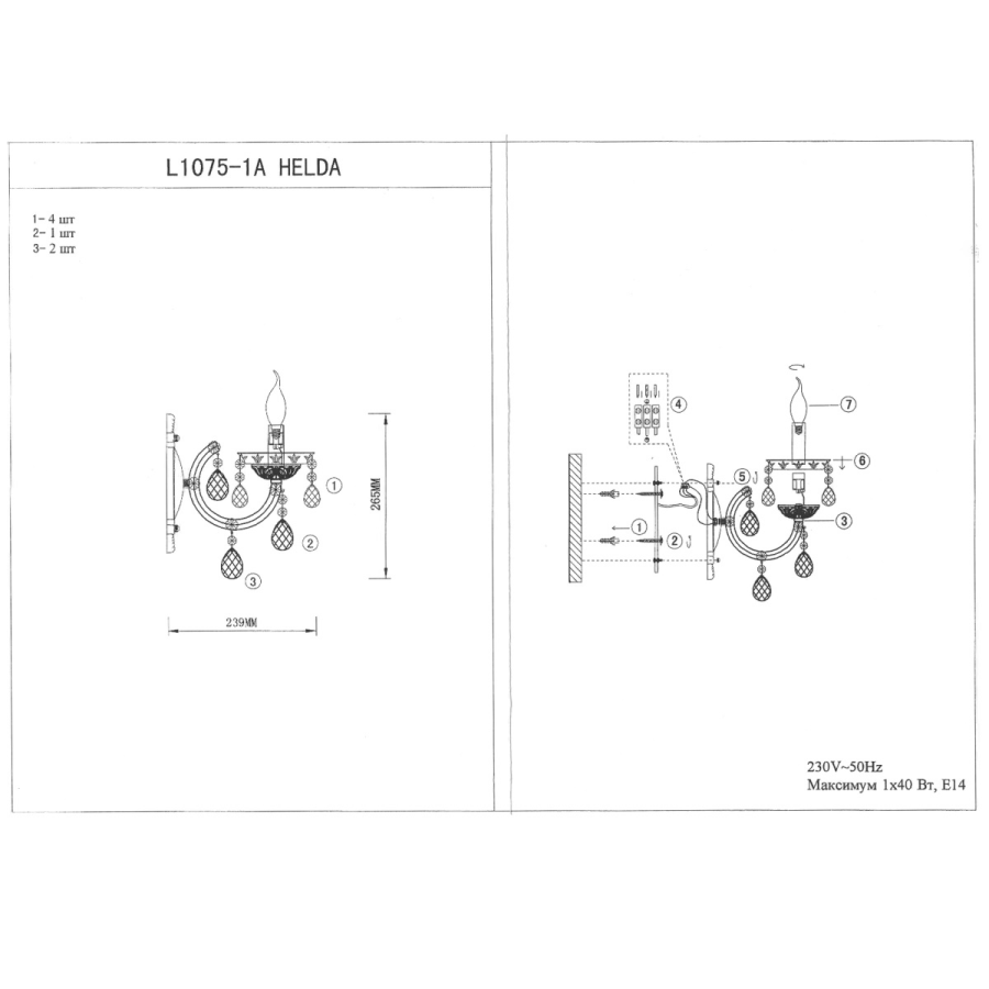 Настенный светильник Helda L1075-1A размером 23х23 см поможет дополнительно осветить пространство и займет особое место в концепции дизайна помещения в классическом стиле. Такой светильник будет уместен на стене над кроватью в спальне или над любимым креслом для чтения в гостиной (можно приобрести парные экземпляры для размещения с двух сторон дивана), возле трюмо с косметическими принадлежностями и в зоне одевания в прихожей. Прибор предназначен для сухих помещений: степень защиты IP20 — защита конструкции от проникновения внутрь предметов диаметром более 12 мм, нет защиты от брызг воды.