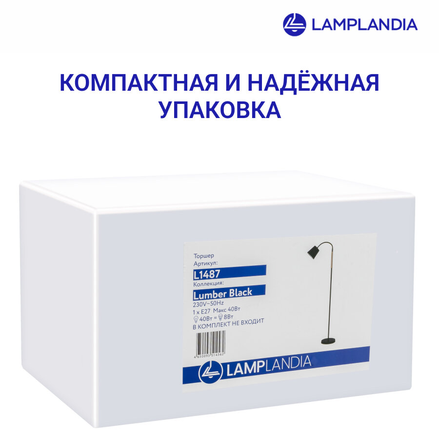 Торшер L1487 LUMBER BLACK – это не только осветительный прибор, но и выразительный элемент декора. Длинная ножка металлического светильника стоит на круглой подставке и вверху на изгибе завершается плафоном, который прикрывает собой лампу и создает направленный поток света в определённую точку, обеспечивая освещение заданной зоны или акцентируя определенный предмет. Торшер LUMBER BLACK полностью черного цвета за исключением небольшого участка на длинной ножке, который выполнен из светлого дерева, что очень удобно при перемещении светильника из одной комнаты в другую. Ламбер отлично подойдет для спальни, детской, кухни, прихожей или лоджии. Напольный светильник Ламбер имеет патрон E27 и мощность 40 Вт. В комплекте вы найдете гарантийный талон и инструкцию. Гарантия на торшер – 5 лет.