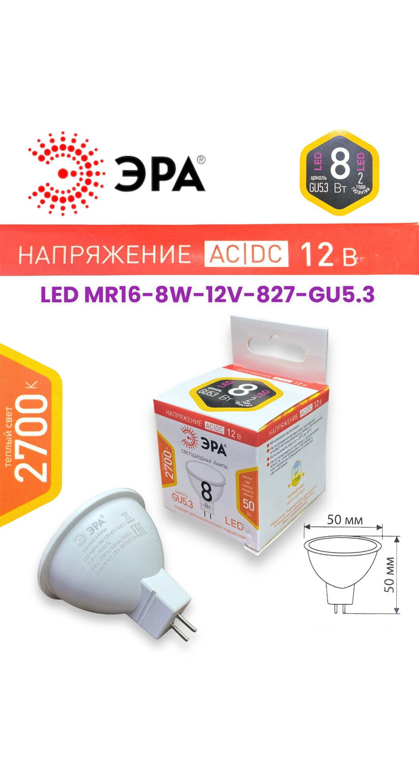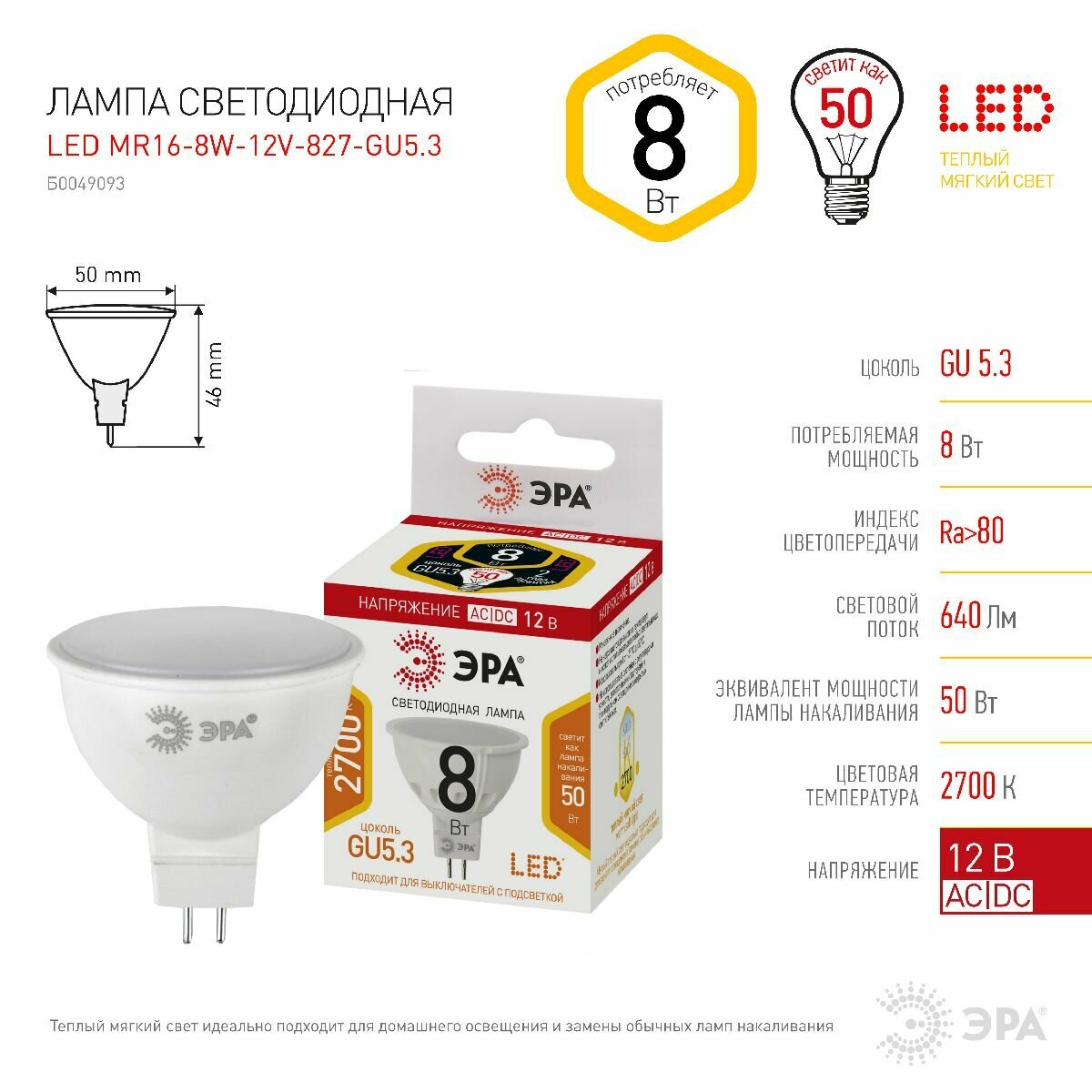 лампа светодиодная ЭРА 8Вт GU5.3 640Лм 2700К MR16 12В спот (Б0049093)