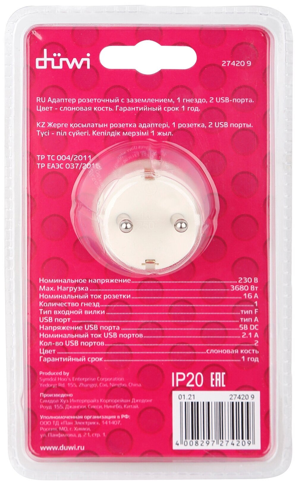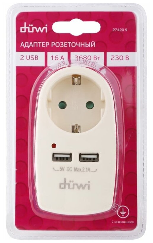 Переходник сетевой универсальный c двумя USB-портами и заземлением предназначен для подключения к сети устройств и мобильных гаджетов суммарной мощностью до 3680 Вт. Адаптер розеточный имеет номинальное напряжение 230 В и может использоваться дома и в офисе. Сетевой переходник позволяет использовать одну розетку для одновременного подключения электроприборов и мобильных устройств. Переходник имеет вилку и 1 круглую розетку типа F (евростандарт), 2 USB-порта с максимальной силой тока 2,1 А. Модель с заземлением, оснащена защитными шторками. Прочный термоустойчивый материал корпуса не деформируется при ударах и не поддерживает горение. Компактный корпус цвета слоновая кость имеет простой лаконичный вид. Заземление увеличивает уровень безопасности при подключении к сети бытовой и офисной техники, оснащённой контактами с заземлением. Защитные шторки обеспечивают безопасность для детей, исключая возможность контакта с токоведущими частями. Степень защиты сетевого адаптера IP20.