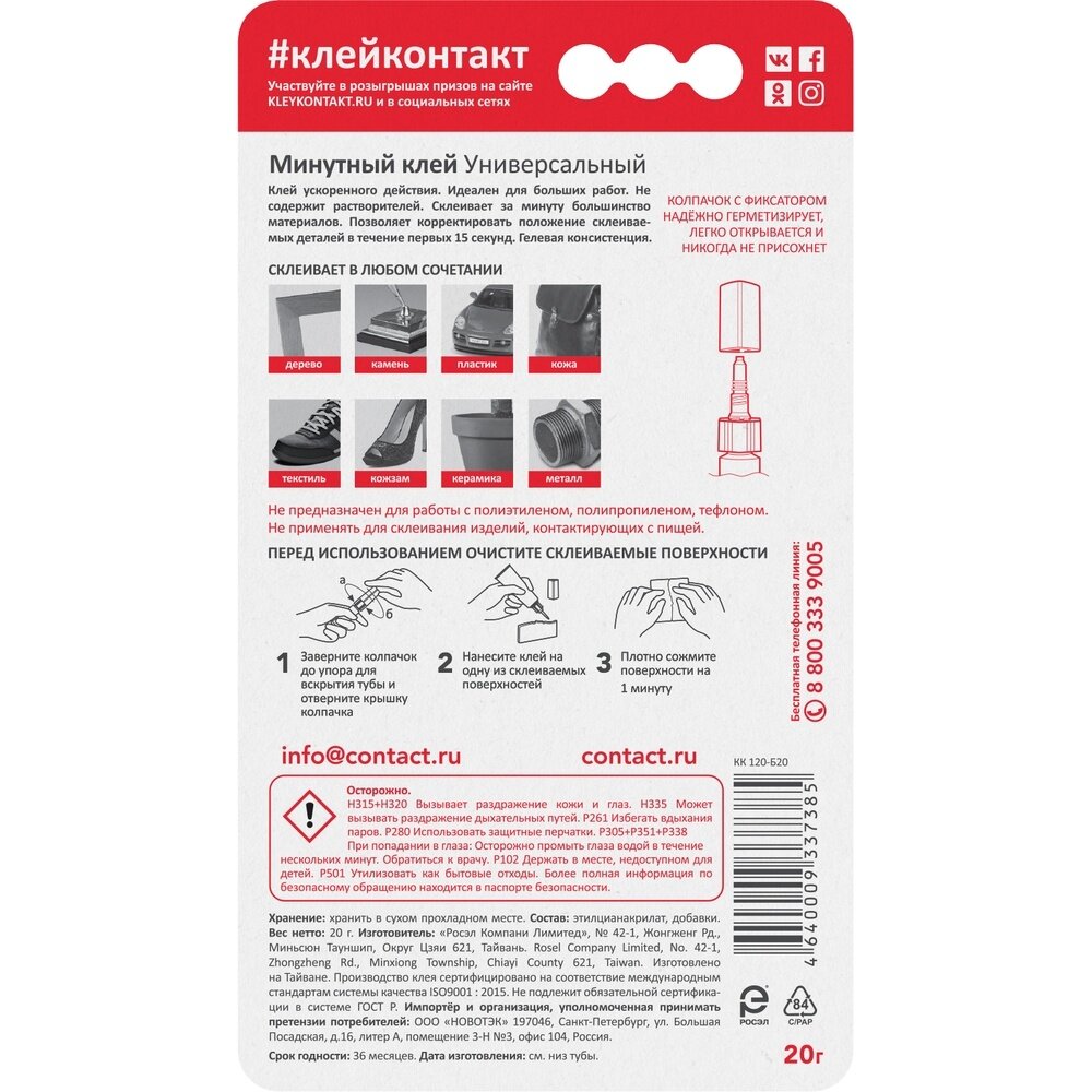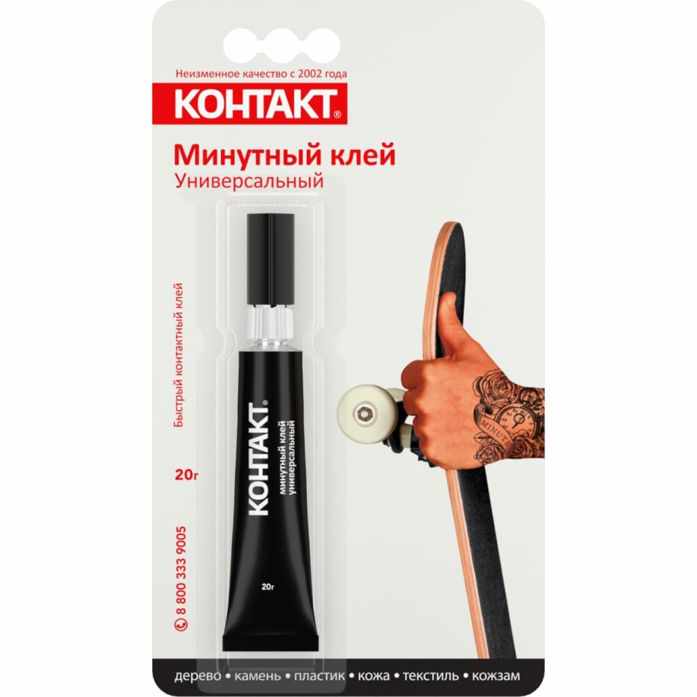 Практически бесцветный клей с максимальной скоростью фиксации среди всей линейки контактных клеев «КОНТАКТ». По своему составу и скорости схватывания близок с супер-клеям, но в отличие от обычных супер-клеев может использоваться на больших склеиваемых поверхностях.Уникальный колпачок с фиксатором надёжно герметизирует, легко снимается и никогда не присохнет.Идеален для крупных работ, когда важен быстрый результат. Не содержит органических растворителей. Может использоваться на вертикальных поверхностях. Эластичный клеевой шов. Инструкция по применению:1. Перед использованием очистите склеиваемые поверхности.2. Заверните колпачок до упора и отверните крышку колпачка.3. Нанесите клей на одну из склеиваемых поверхностей.4. Плотно сожмите поверхности на 1 минуту.При необходимости удалить клей с поверхностей или с рук, используйте Очиститель клея «КОНТАКТ» (используйте в соответствии с инструкцией к Очистителю).