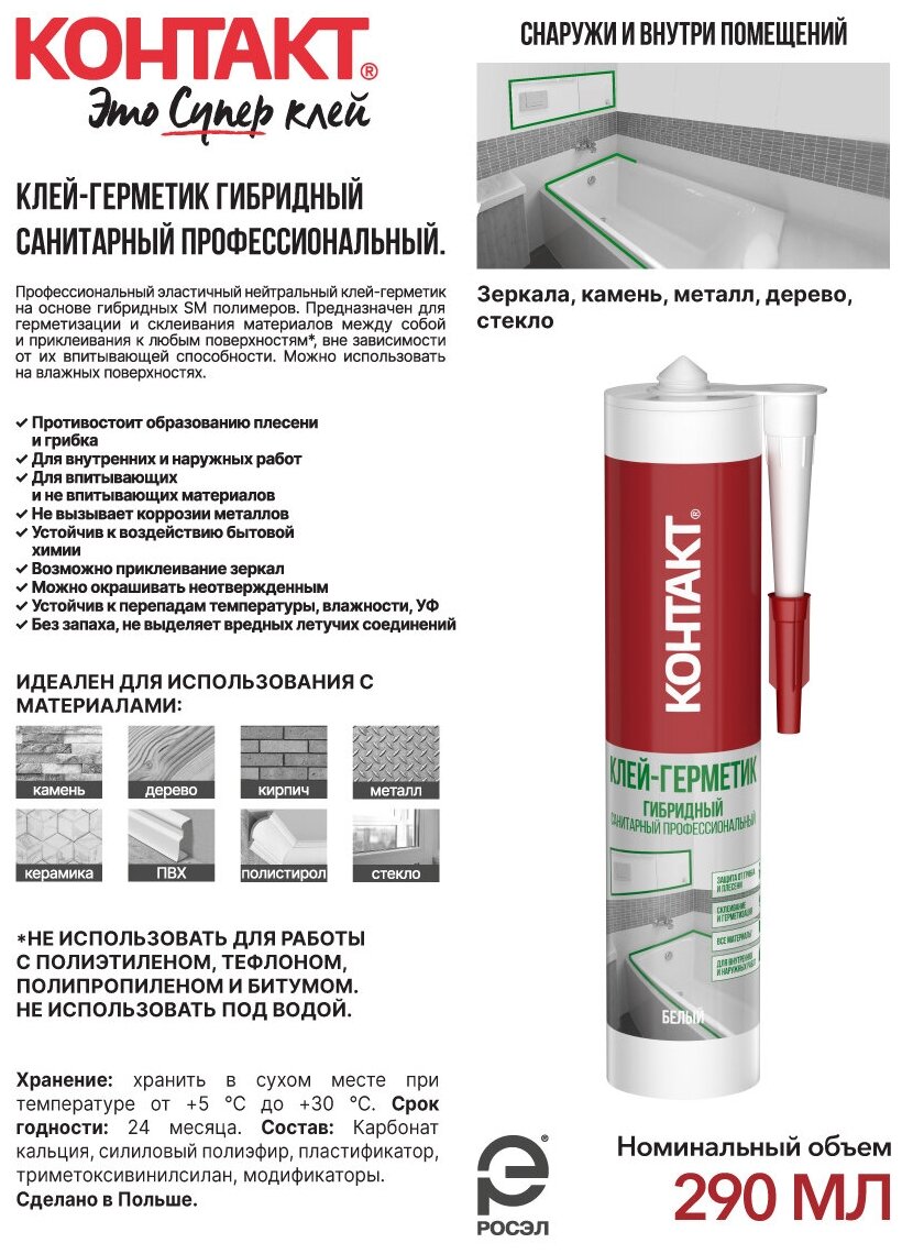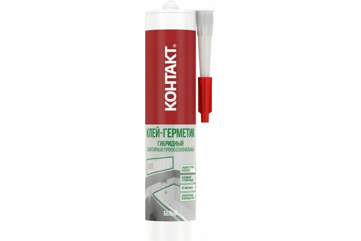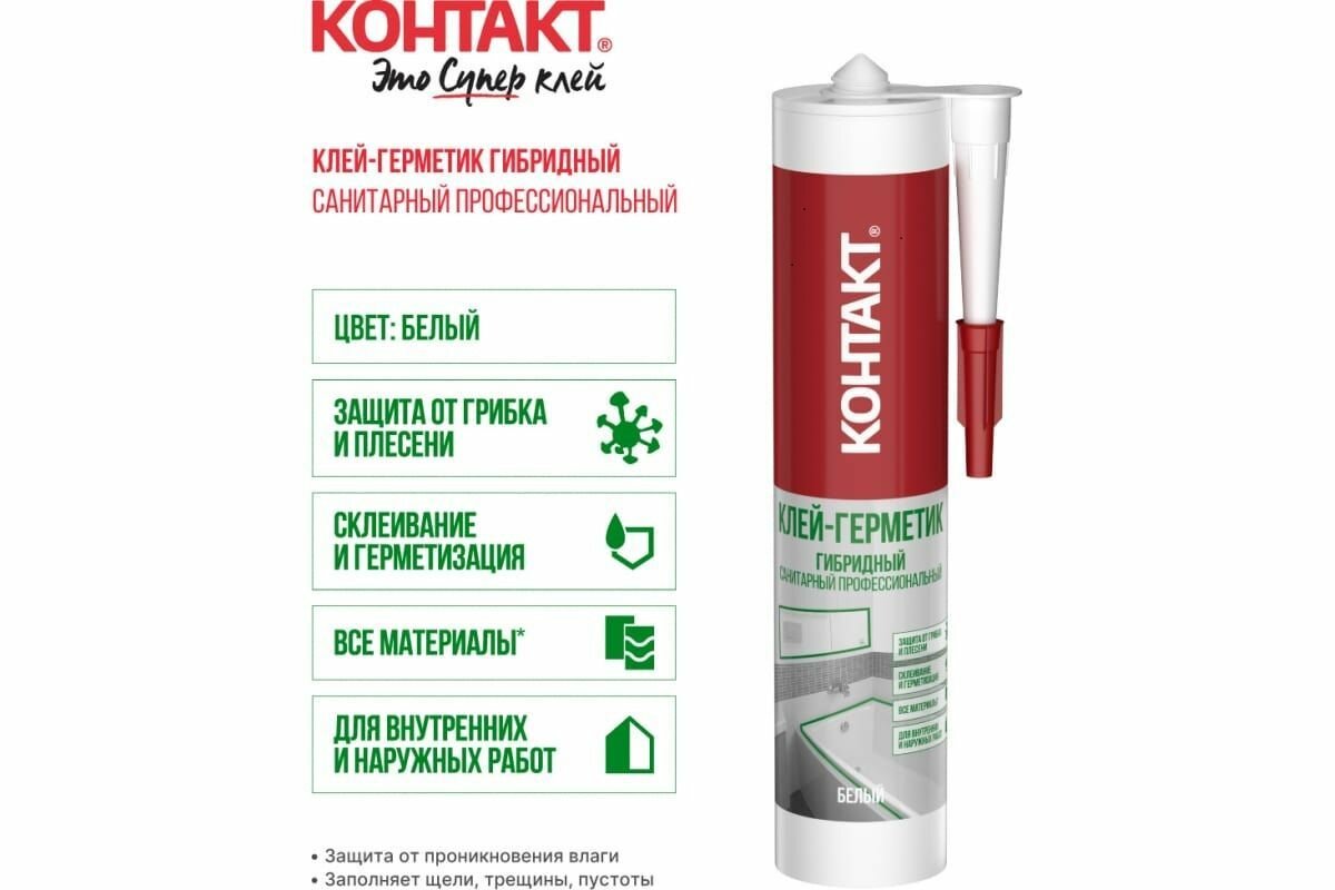 Клеи-герметики КОНТАКТ производятся по уникальной технологии гибридных полимеров, благодаря чему они могут использоваться как для приклеивания любых материалов, так и для герметизации швов. Клеи-герметики КОНТАКТ подходят для профессионального и бытового использования. Для их применения не требуется дополнительных инструкций и специальных навыков .Клеи-герметики КОНТАКТ производятся по уникальной технологии гибридных полимеров, благодаря чему они могут использоваться как для приклеивания любых материалов, так и для герметизации швов. Профессиональный эластичный прозрачный нейтральный клей-герметик основе гибридных SM полимеров. Предназначен для герметизиции и склеивания материалов между собой и приклеивания к любым поверхностям*, вне зависимости от их впитывающей способности, при проведении монтажных и отделочных работ внутри и снаружи помещения. Можно использовать на влажных поверхностях. Важно! Не использовать для работы с полиэтиленом, полипропиленом, тефлоном и битумом. Особенности: Сочетает в себе все преимущества монтажных клеев и герметиков: сильное и быстрое схватывание, надежная герметизация, защита от грибка, устойчивость к перепадам влажности и температур, экологически безопасный.