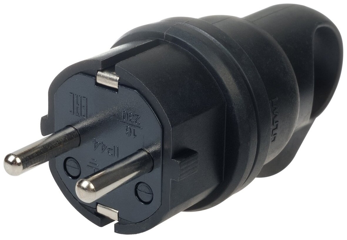**Вилка каучуковая** — Силовые вилки с заземлением предназначены для подключения кабеля в сложных эксплуатационных условиях, в том числе на открытом воздухе. Отличаются повышенной прочностью и термоустойчивостью. В зависимости от расположения ввод-сальника для кабеля, вилки каучуковые могут быть прямыми или угловыми. Корпус вилки оснащён дополнительным буртиком для обеспечения плотной фиксации в розетке.