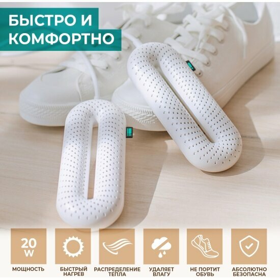 Сушилка для обуви быстро и эффективно высушит любую обувь. Мощность устройства — 20 Вт, что делает его нагрев максимально быстрым. Ключевой особенностью данной модели являются расположенные по всему корпусу отверстия, которые позволяют равномерно распределять тепло и делать процесс удаления влаги быстрым и качественным. Температурный режим устройства подобран таким образом, что исключена порча или деформация обуви, что делает процесс сушки максимально безопасным. Дизайн сушилки позволяет ей идеально умещаться в любой обуви, равномерно и всесторонне распределяя тепло внутри. Лёгкое и компактное устройство будет незаменимо не только дома, но и в поездках.