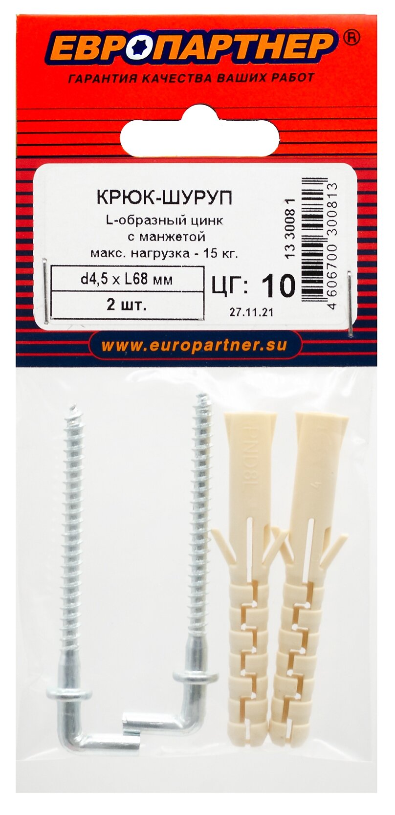 шуруп-крюк L-образный 45х70мм с манжетой с дюбелем 2шт Европартнер d4,5хL68 мм 2 шт.
