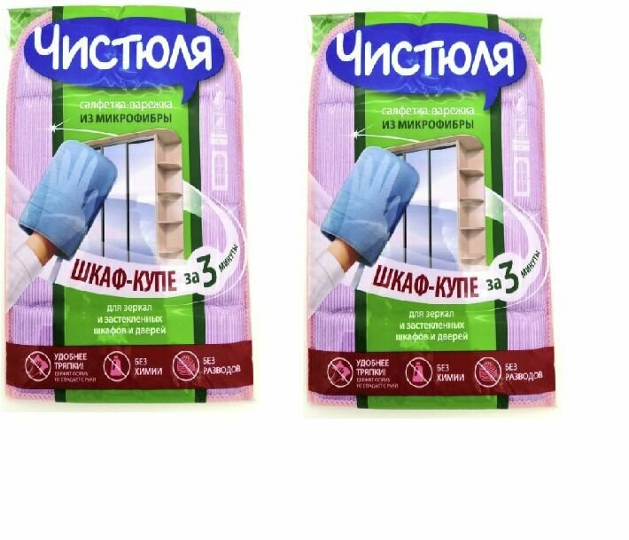 Чистюля Салфетка -варежка из микрофибры "Шкаф купе за 3 минуты",23x16 см удобнее тряпки! Держит форму, не спадает с руки. Без моющих средств: не нужно смывать. Без следов от пальцев: рука закрыта варежкой и не оставляет следов. Также для зеркал и застекленных шкафов и дверей. Чистый шкаф купе за 3 минуты Как это возможно? Брызгаем водой на зеркало. Протираем поверхность салфеткой-варежкой. В комплекте 2 штуки