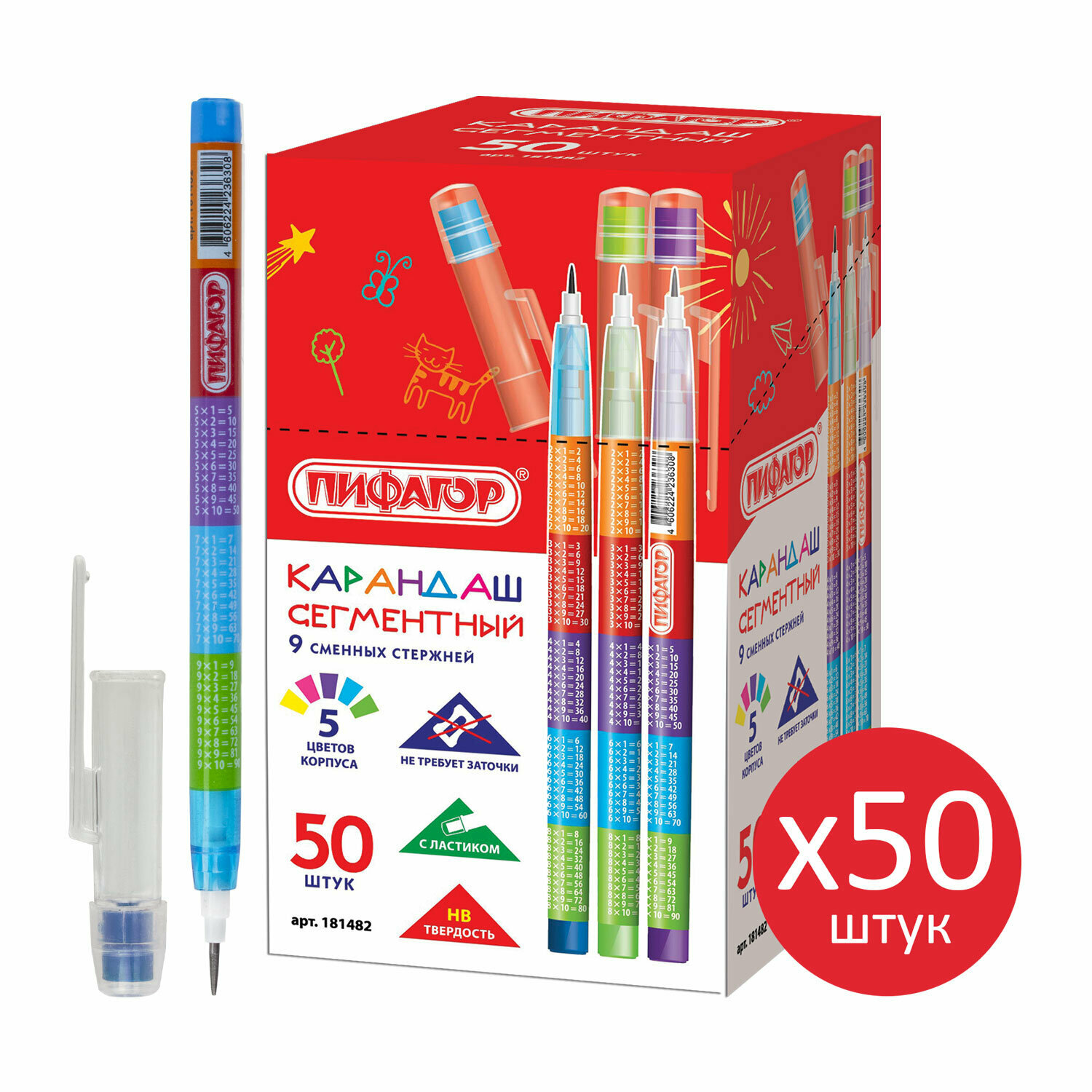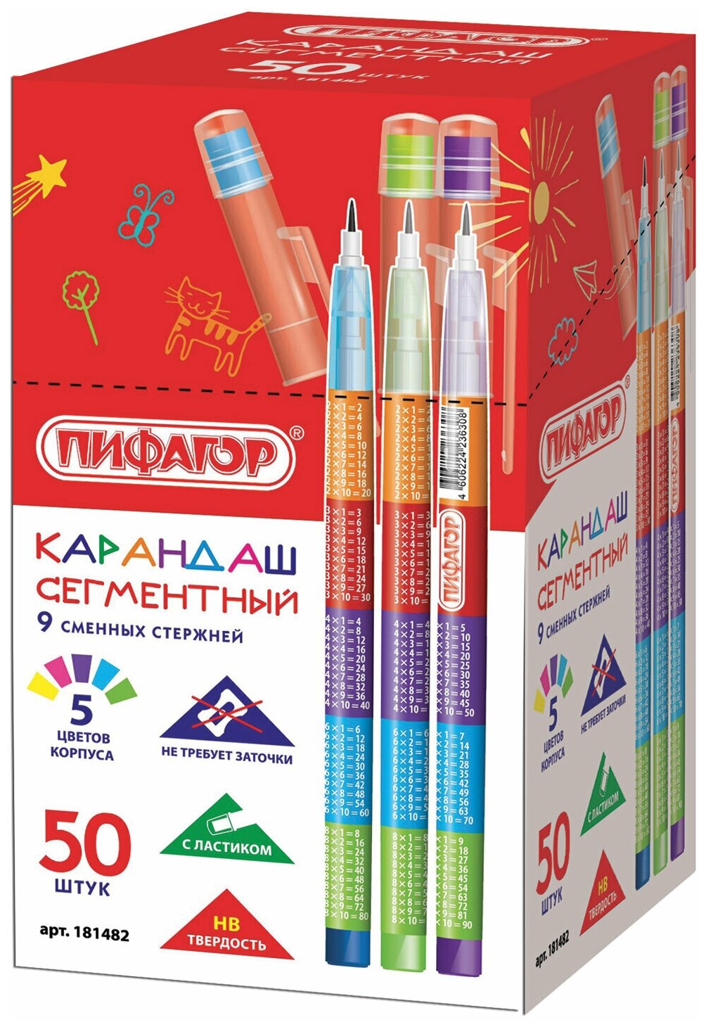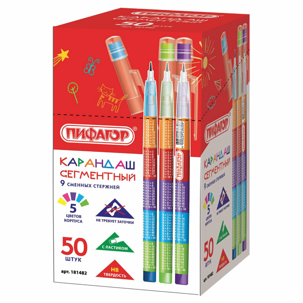 Сегментный чернографитный карандаш пифагор с печатью "Таблица умножения" на корпусе прекрасно подходит для детского творчества, незаменим на уроках в младших классах.