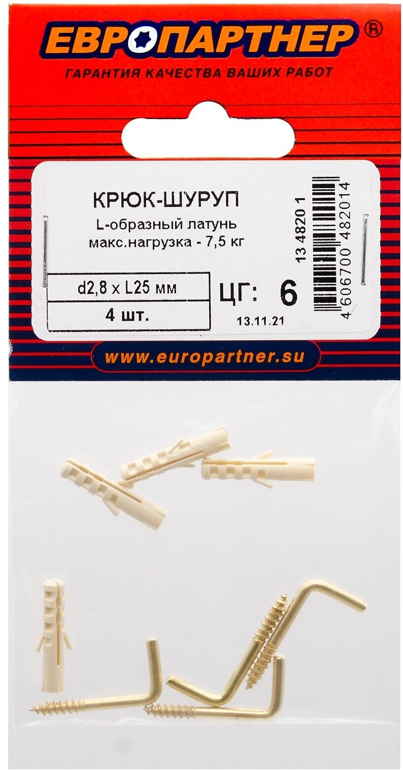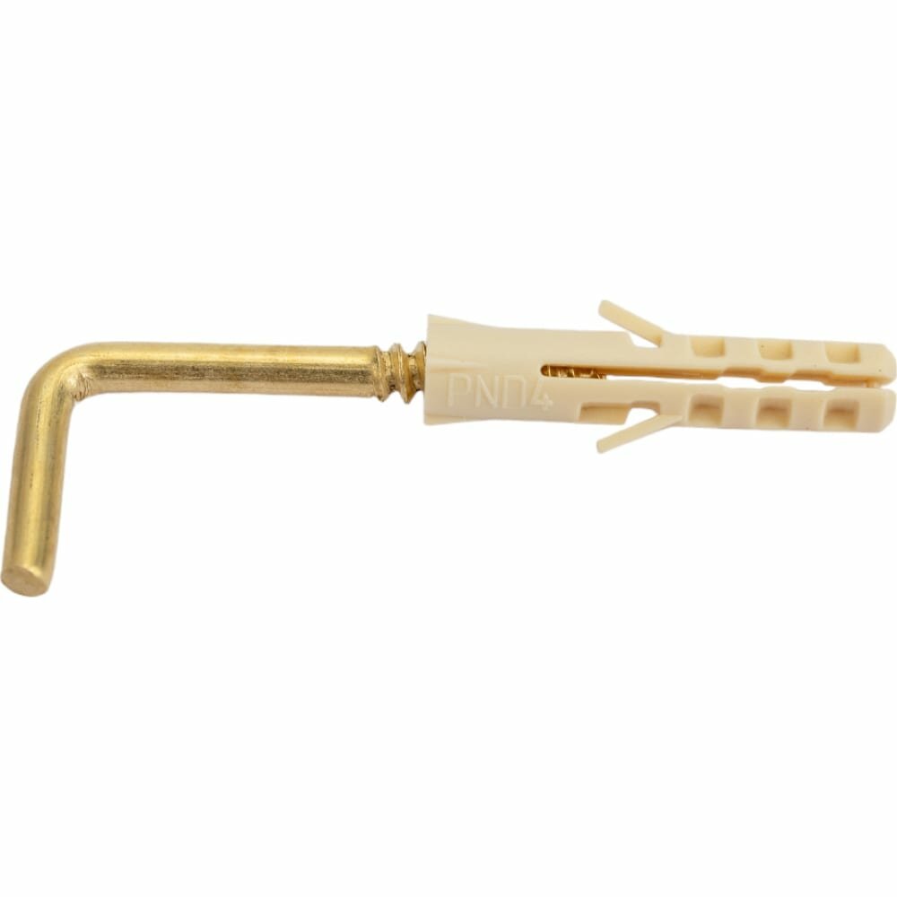 шуруп-крюк L-образный 25х25мм латунь с дюбелем 4шт Европартнер d2,8хL25 мм 4 шт.