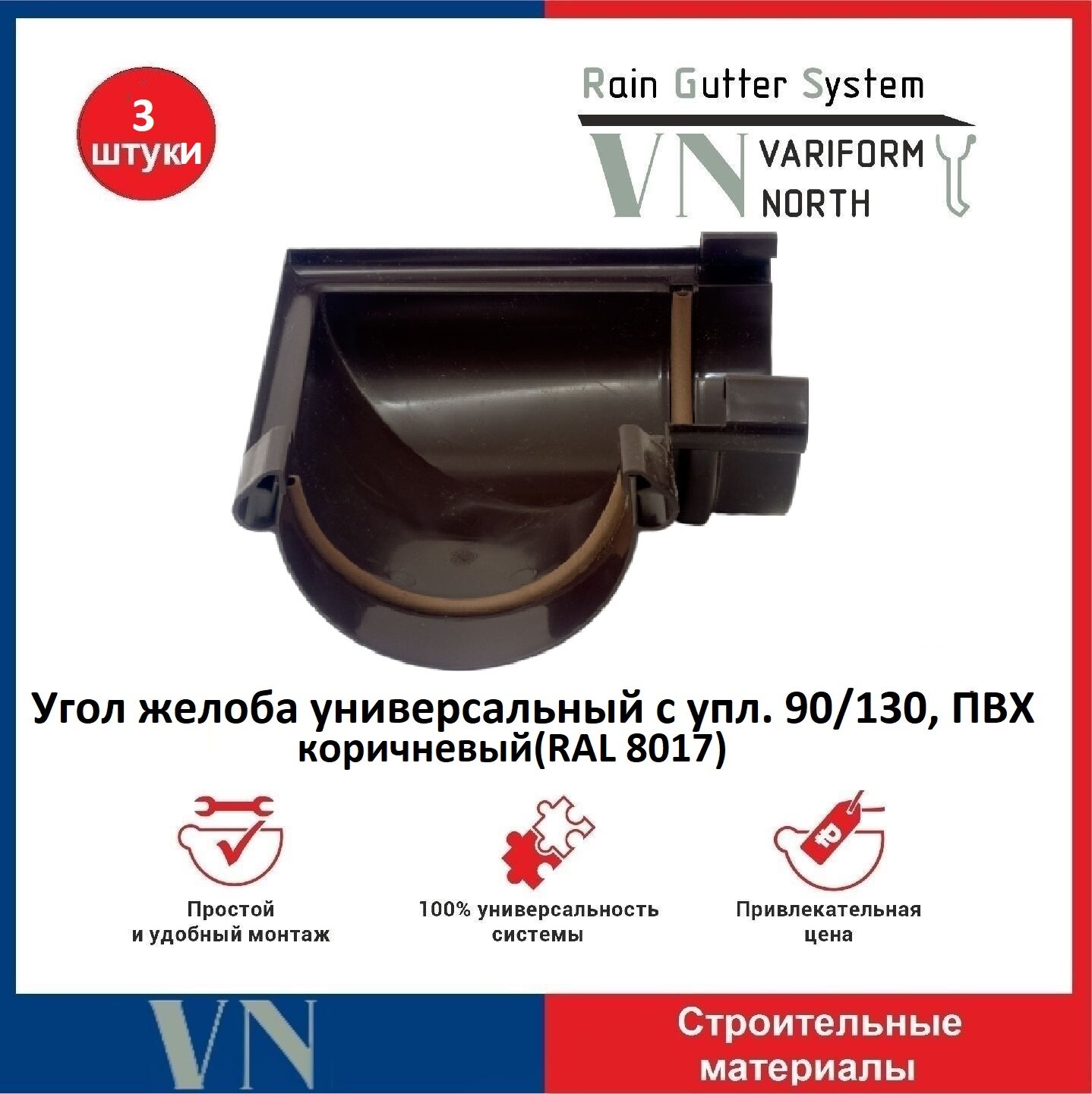 Угол желоба универсальный с уплотнителем 90/130 предназначен для изменения направления потока воды в желобе на 90°. Подходит как для внешнего, так и для внутреннего угла кровли. Снабжен уплотнителем для герметизации соединения. Цвет коричневый. Поставляется в количестве 3 штук.