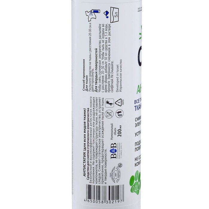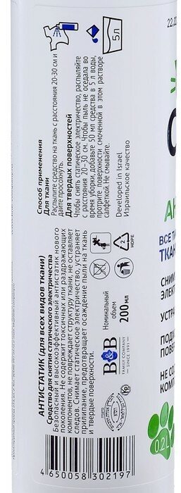 | Способ применения | После длительного хранения перед употреблением взболтайте. Для твердых поверхностей: для снятия статического электричества – распылить с расстояния 20-30 см Чтобы пыль не оседала во время уборки, добавить 50 мл средства в 5 л воды, протереть поверхности смоченной в этом растворе салфеткой. Не смывать. Для тканей: распылить средство на ткань с расстояния 20-30 см и дать просохнуть. |