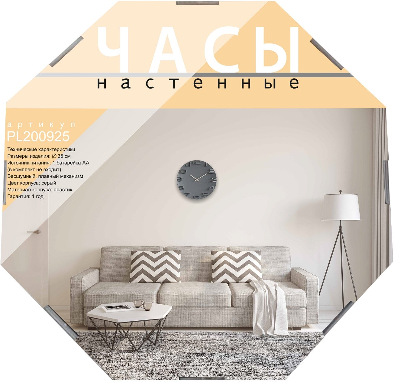 Настенные часы с артикулом PL200925 изготовлены в форме круга, который является символом бесконечности и совершенства. Данная модель представляет собой часы открытого типа с корпусом из качественного пластика. Отлично дополнят помещение с современным дизайном. На сером циферблате часов расположены арабские цифры и две стрелки. Часы сохранят тишину в помещении благодаря использованию бесшумного механизма плавного хода, который работает от батарейки стандарта АА (не входит в комплект).